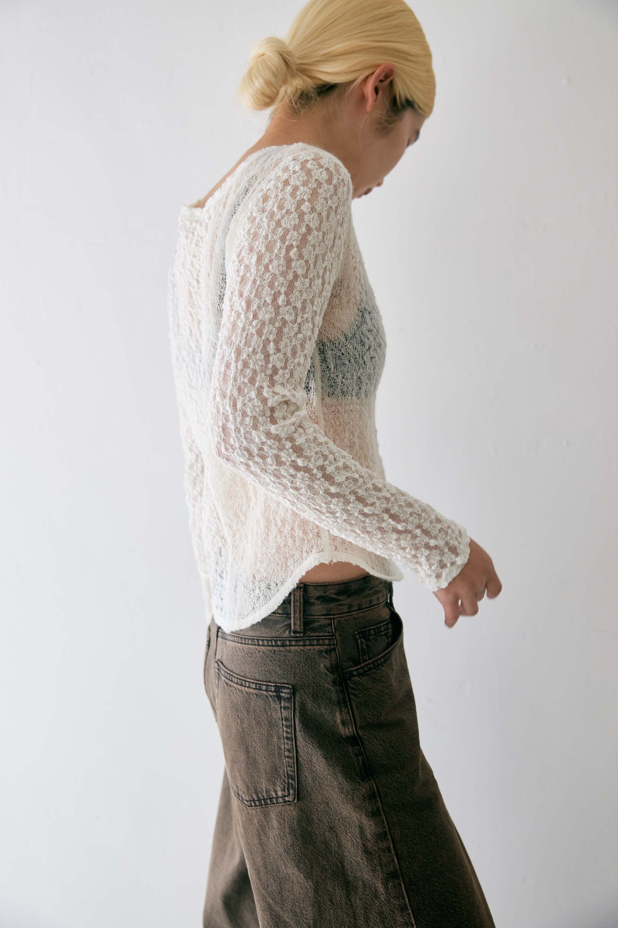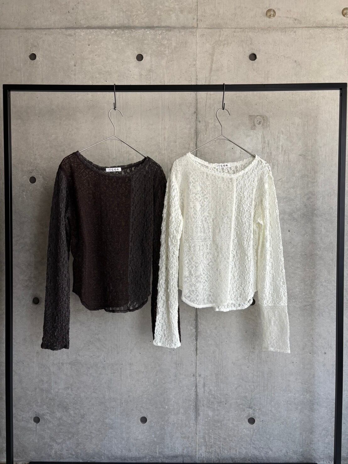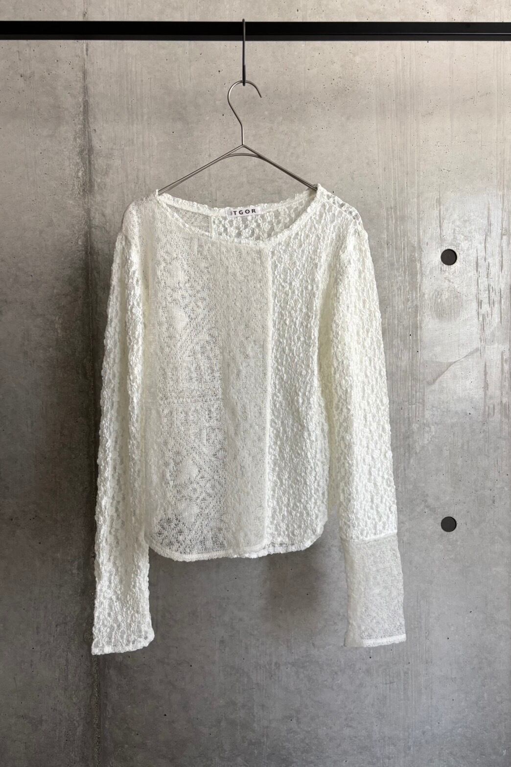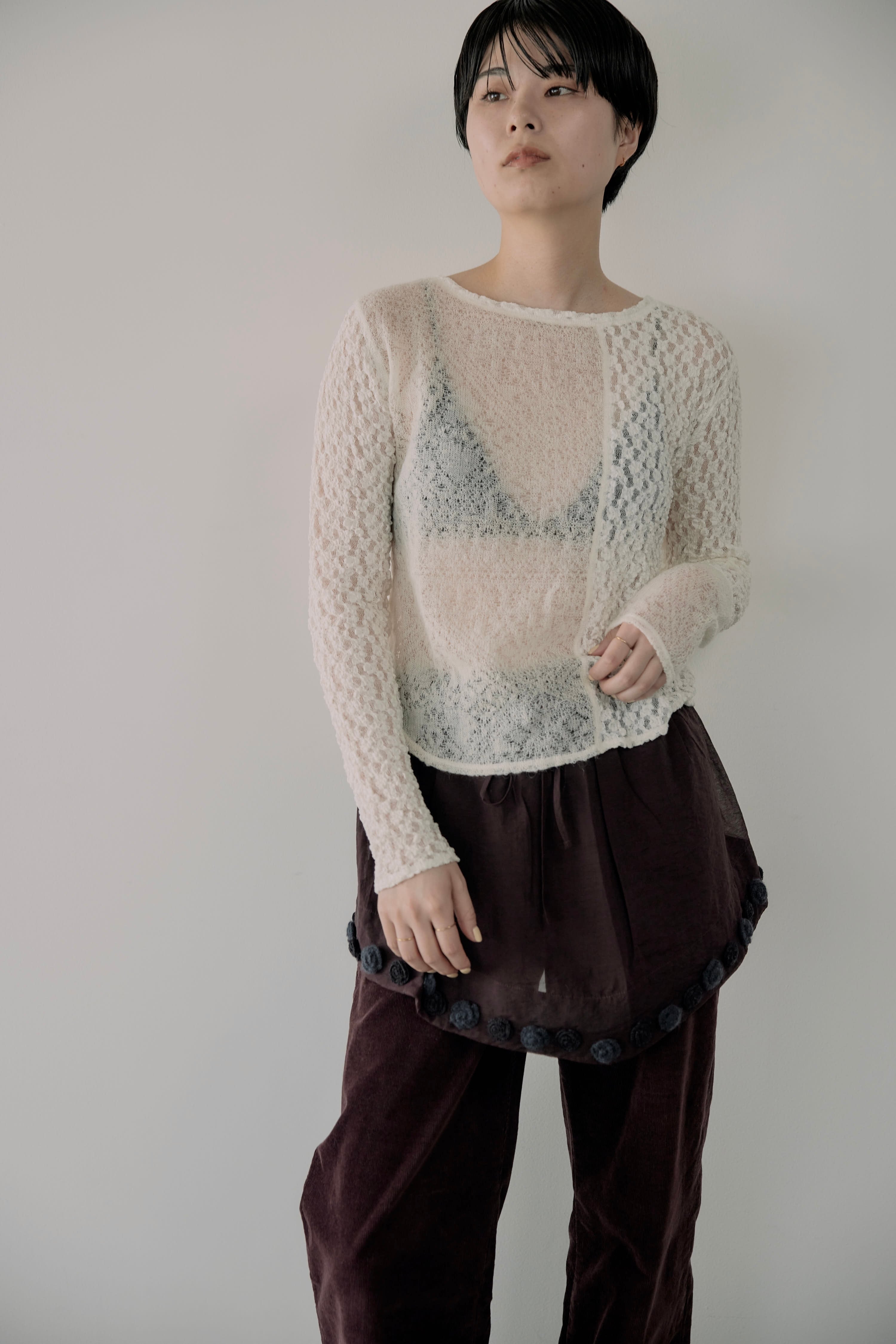 モヘア混の糸とクリアな糸を組み合わせてレース編みにした生地を、シュリンクレースと合わせました。シルエットはベーシックなロンTですが、アシンメトリーな切り替えで1枚で着てもデザイン性のあるレーストップスです。