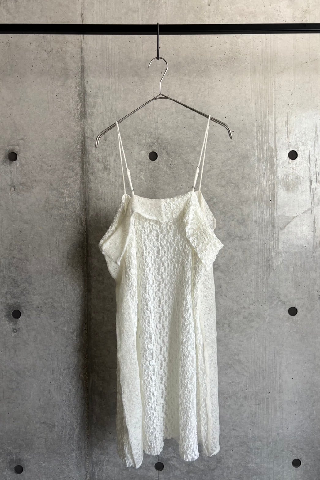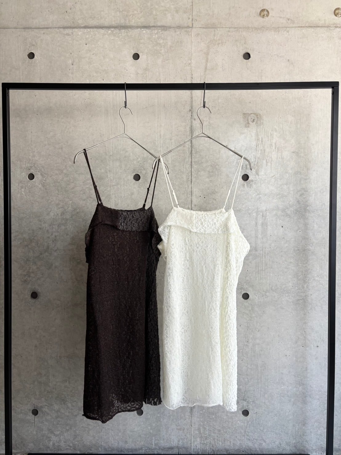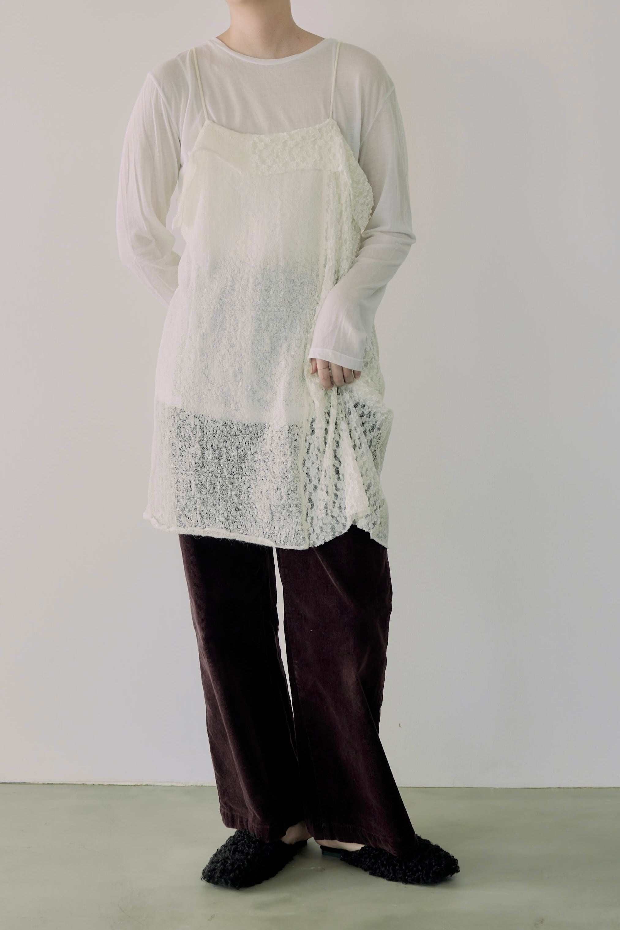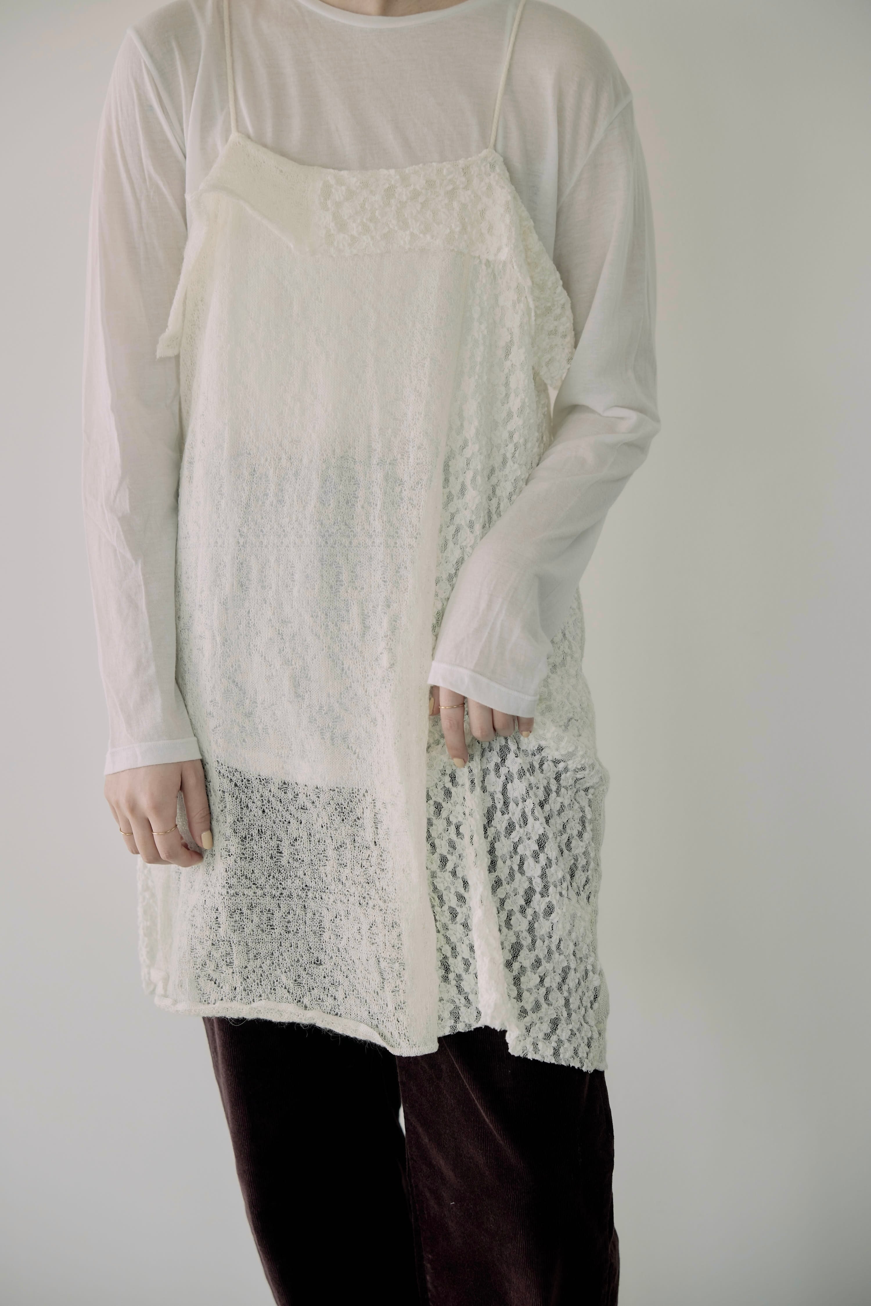 モヘヤ混の糸とクリアな糸を組み合わせてレース編みにした生地を、シュリンクレースと合わせました。アシンメトリーな切替が特徴のロングキャミソールで、まだまだ暑い時期でも着られ、季節感も取り入れられるアイテムです。