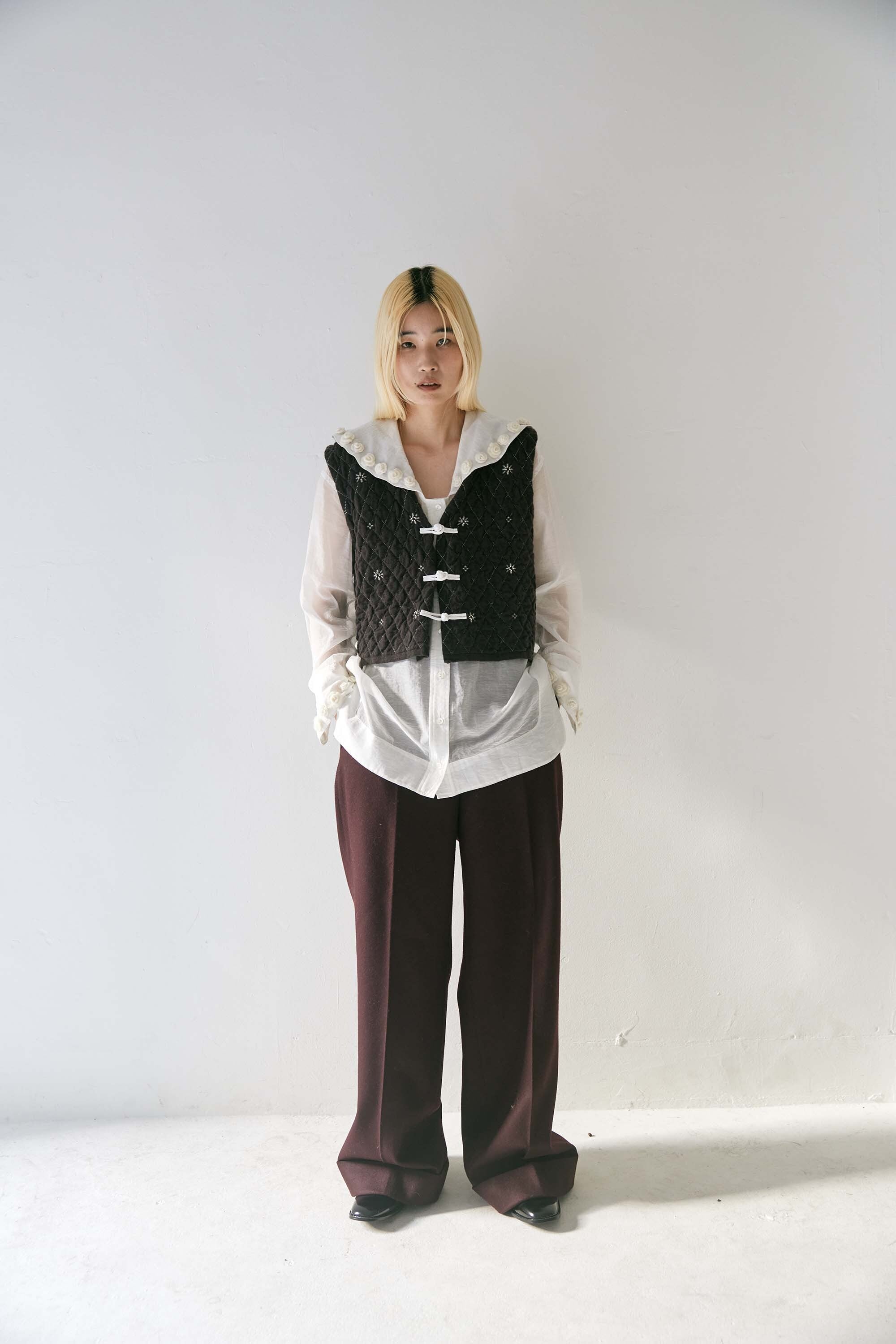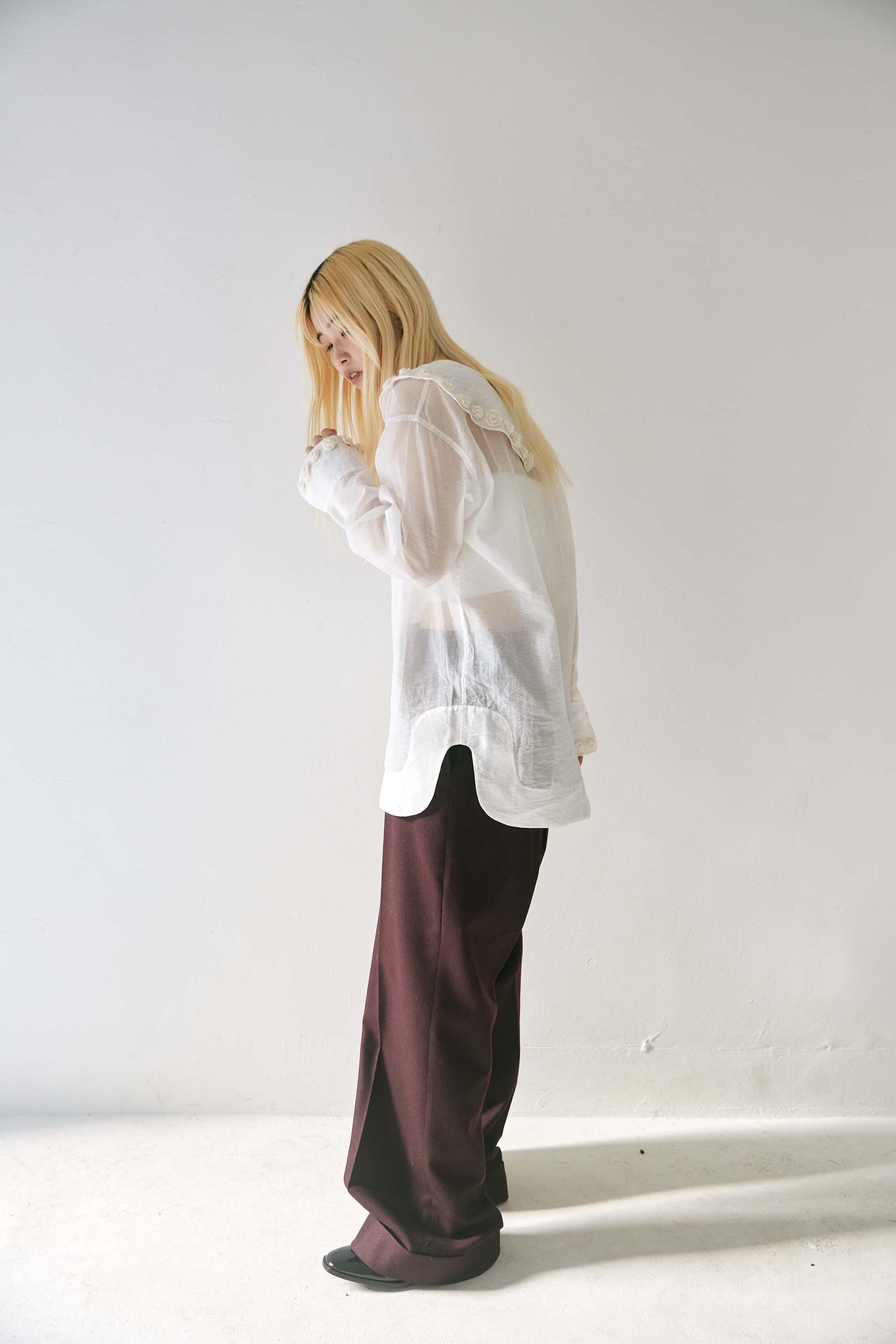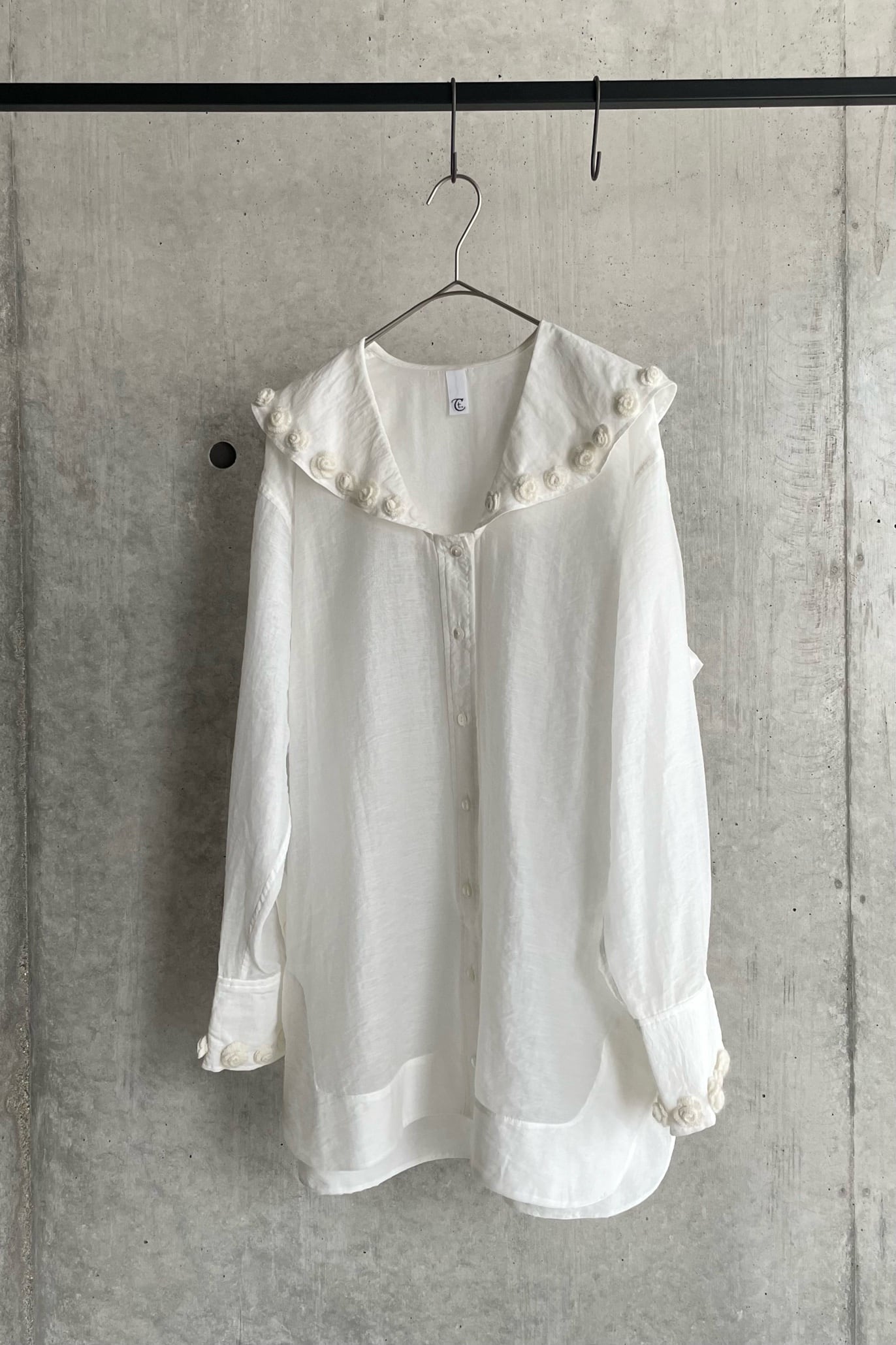 キャミソールと同素材のシアー素材のブラウスです。モヘアとウールの小さいバラのモチーフがついており、秋冬〜春にかけて着ていただける素材感です。お尻がすっぽり隠れる丈で、ゆとりがあるサイズ感ですので、中にニットやタートルを着込めます。ベストやジャケットを重ねてもちらっと見えるモチーフが可愛い1着です。