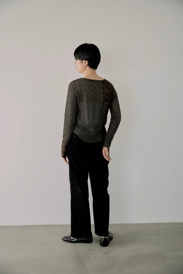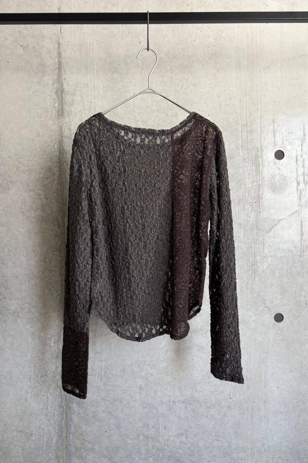 モヘア混の糸とクリアな糸を組み合わせてレース編みにした生地を、シュリンクレースと合わせました。シルエットはベーシックなロンTですが、アシンメトリーな切り替えで1枚で着てもデザイン性のあるレーストップスです。