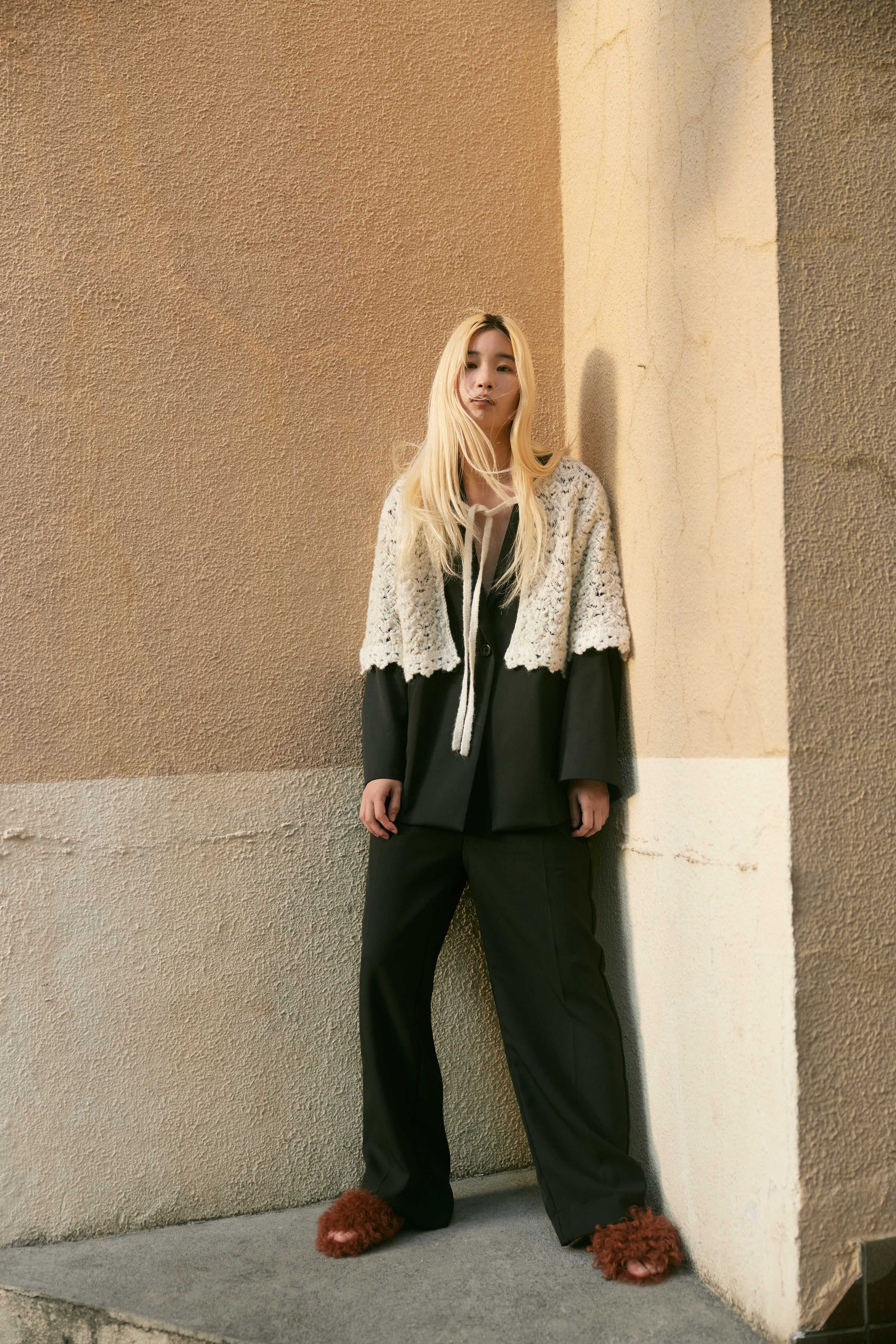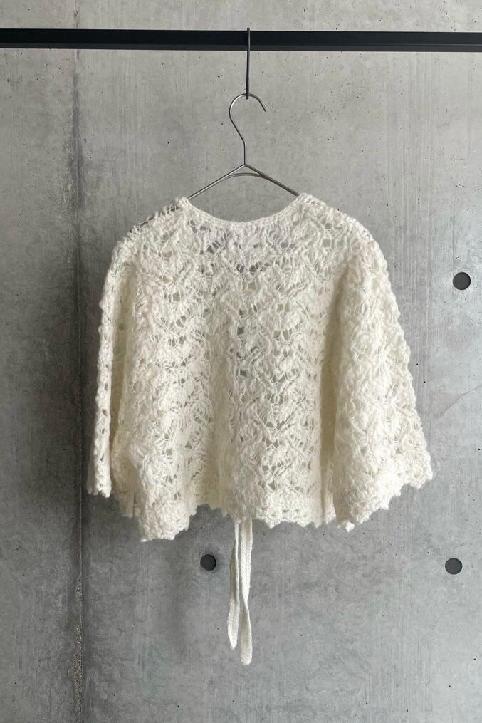 オリジナルで作ったウールスラブリリヤンに、細番手のKidmohairを引き揃えて、粗野感はありつつも複雑な繊細さを感じられる素材感の透かし編みのボレロです。端のかぎ針トリミングがとても可愛く、甘くドリーミーなアイテムですが、ジャケットや衿付きシャツなどかっちりしたスタイルに合わせると甘くなり過ぎずに着られるかなと思います。