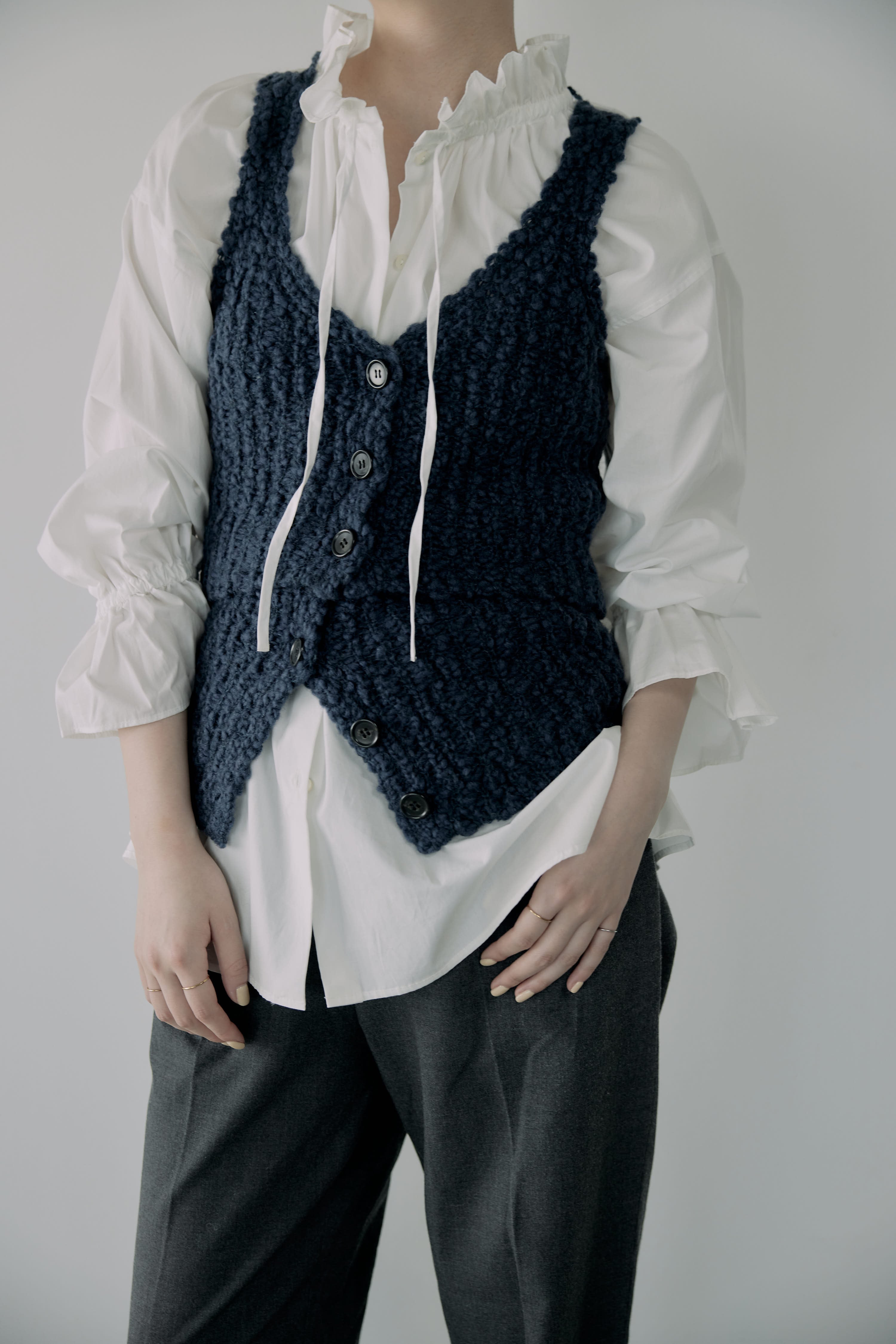 肩紐のデザインが可愛いキャミソールと、ビスチェにも使える裾パーツがセットになった、それぞれ別でもお使いいただけるセパレートキャミソールです。オリジナルで作ったウールスラブリリヤンに、細番手のKidmohairを引き揃えて、粗野感はありつつも複雑な繊細さを感じられる素材感です。