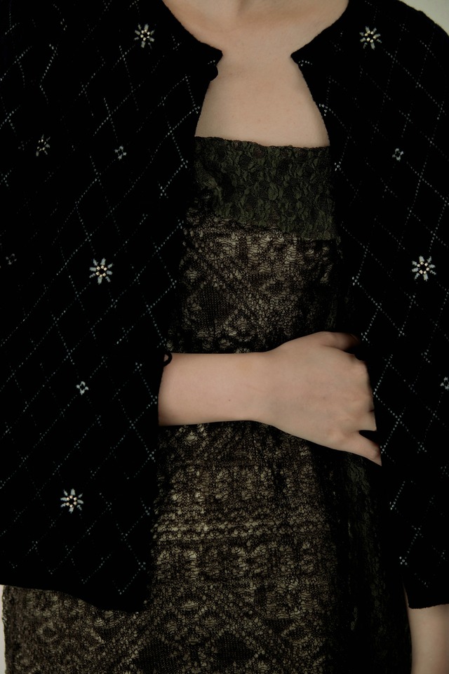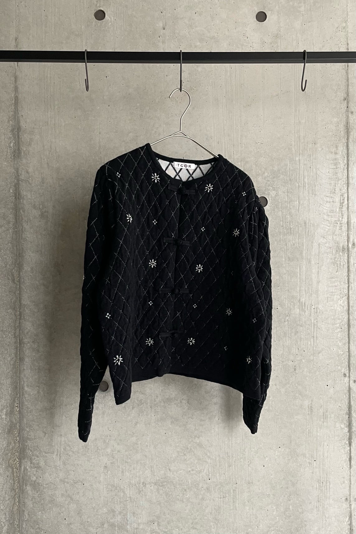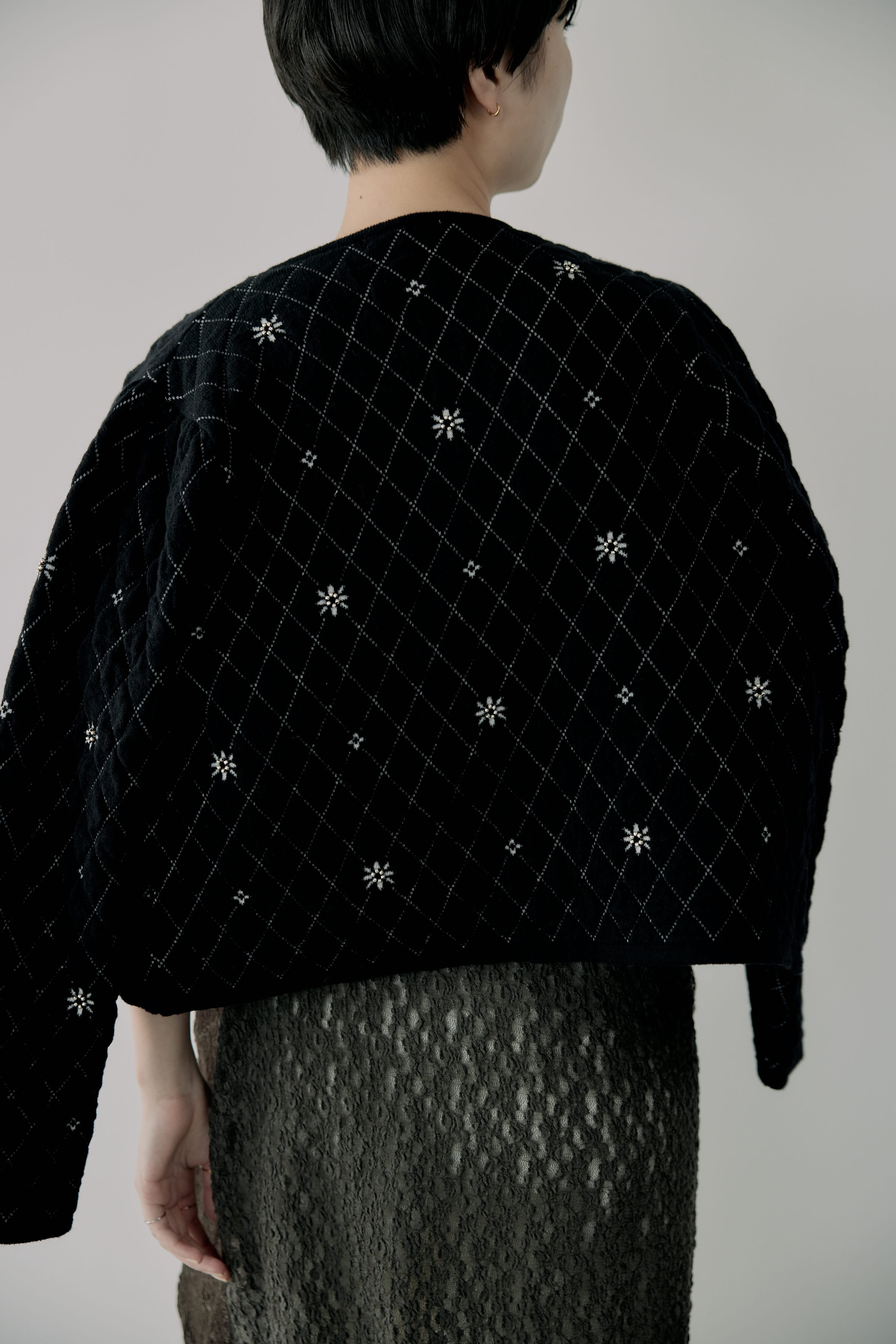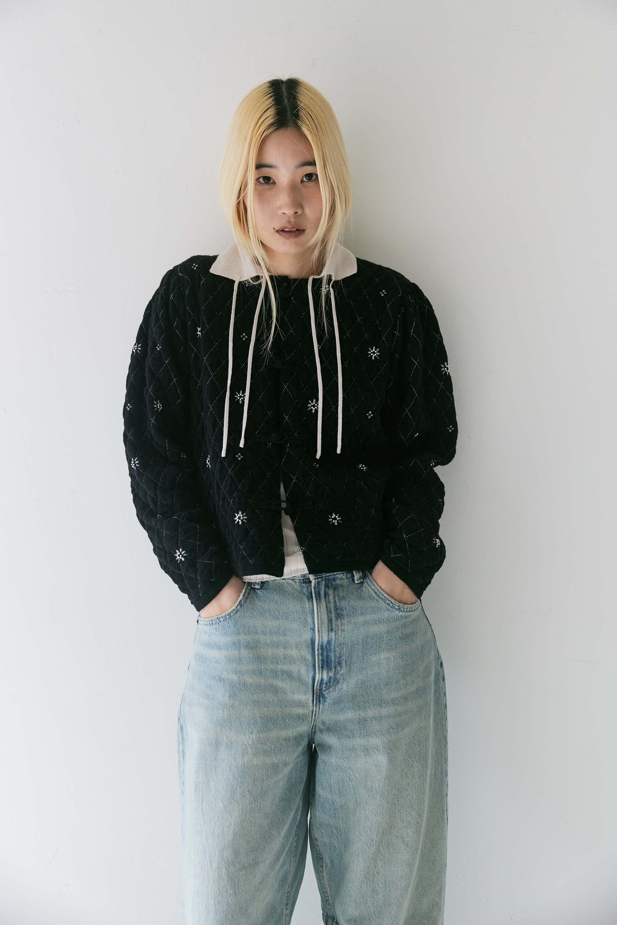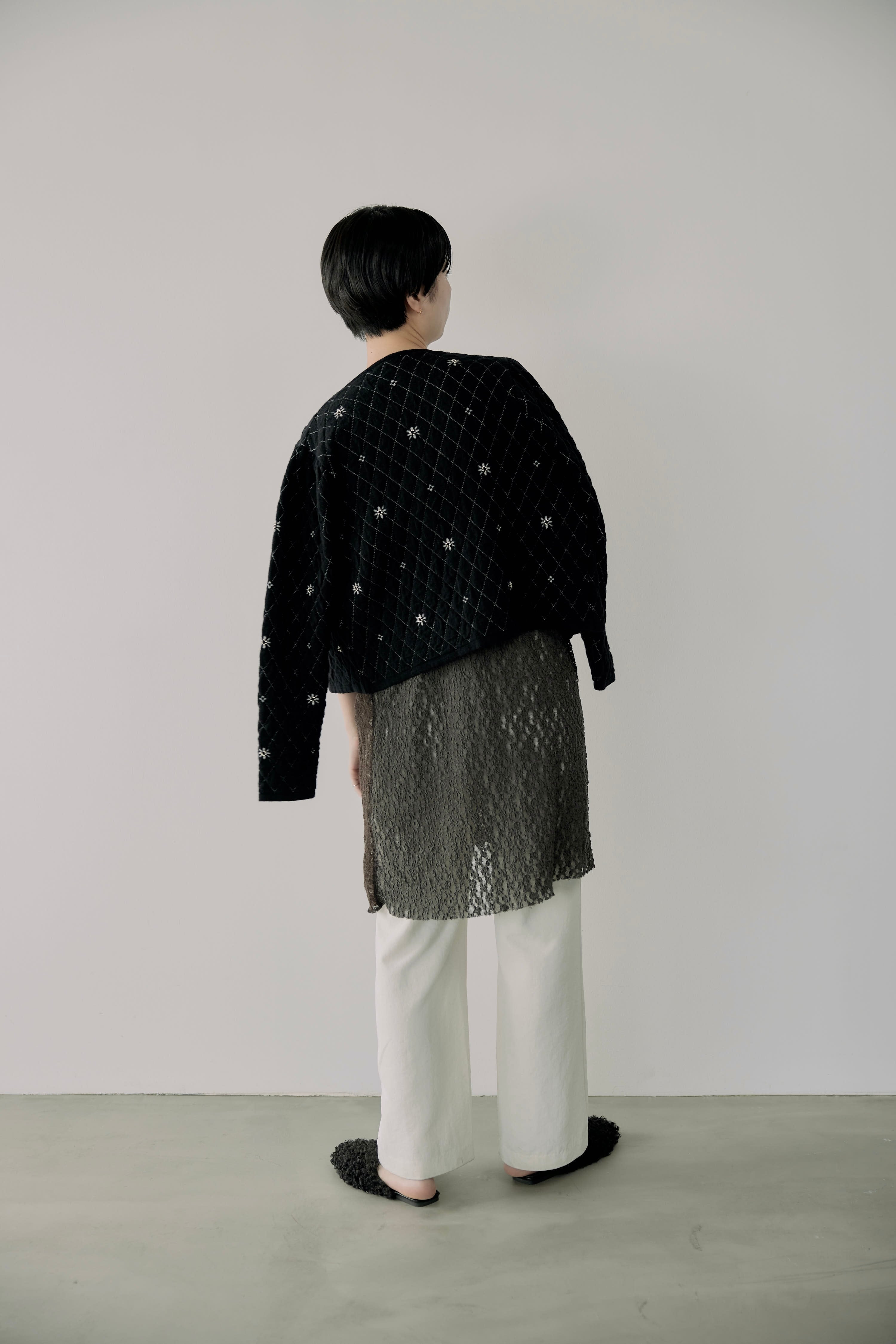 毎年人気のキルティングビーズ刺繍シリーズ。糸の伸縮性の違いを利用したキルティング風のジャガード編みにさりげなく煌めくビーズ刺繍がとても可愛いです。ヴィンテージ感のあるくすんだシルバービーズを手作業で一つ一つ丁寧に付けています。たくさんの空気を含んだウール混の糸を使用しているのでとても軽くて温かいのが特徴です。今年は袖にタックを入れてパフスリーブにしました。羽織りとしても使えますが、薄手なので上からアウターを着用していただくことも可能です。