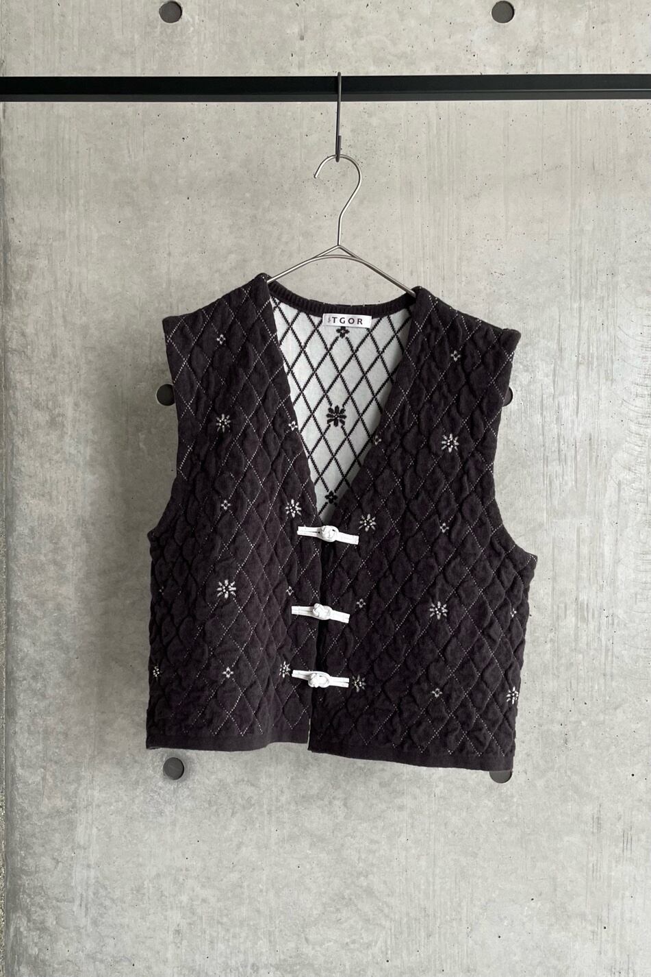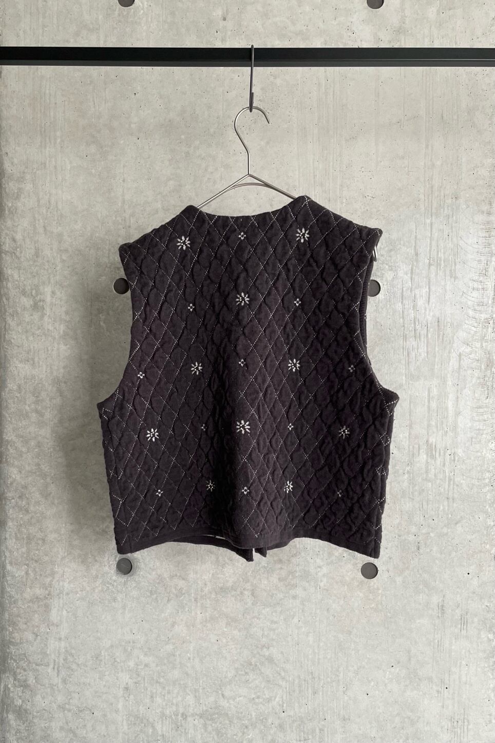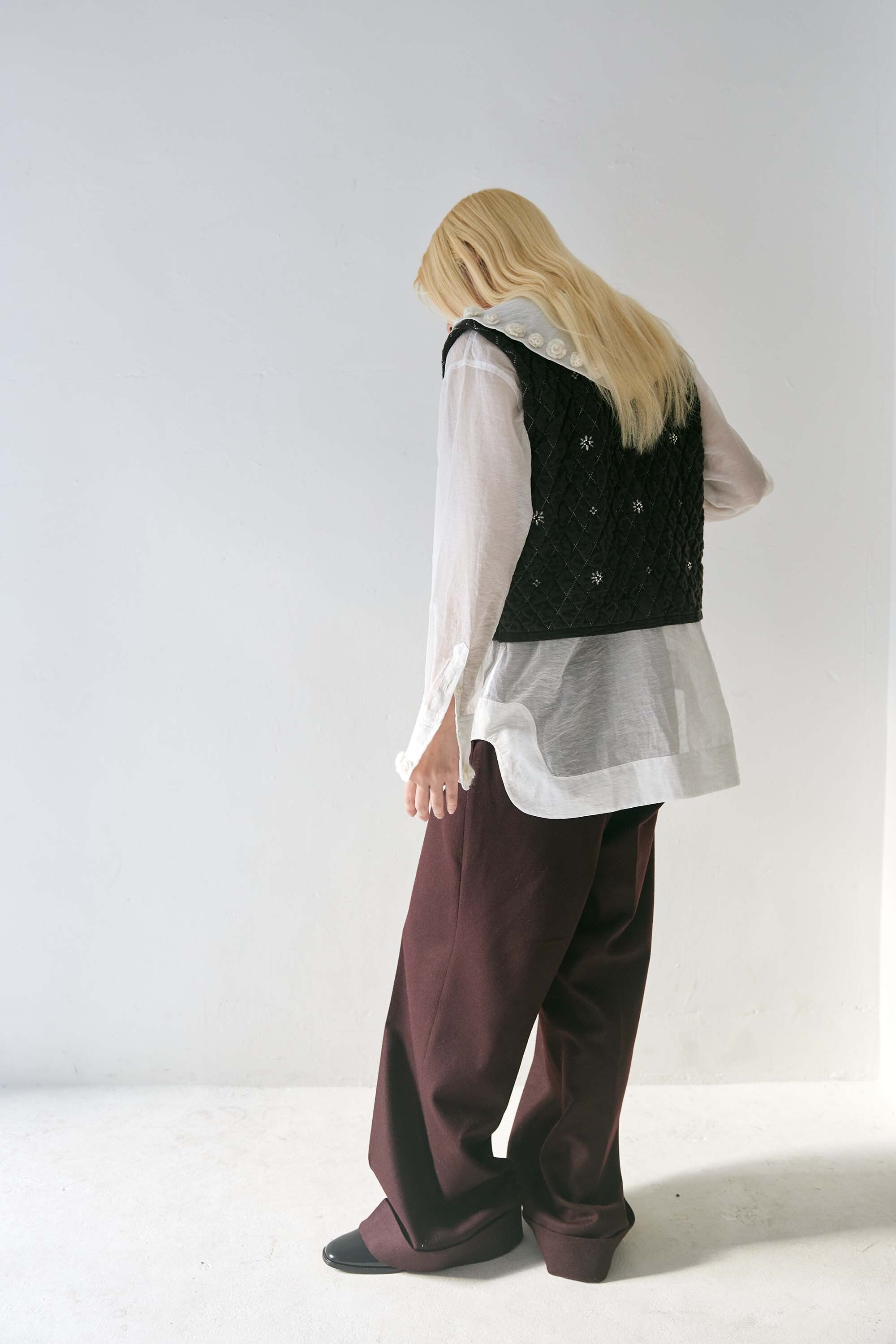 毎年人気のキルティングビーズ刺繍シリーズ。糸の伸縮性の違いを利用したキルティング風のジャガード編みにさりげなく煌めくビーズ刺繍がとても可愛いです。ヴィンテージ感のあるくすんだシルバービーズを手作業で一つ一つ丁寧に付けています。たくさんの空気を含んだウール混の糸を使用しているのでとても軽いのが特徴です。