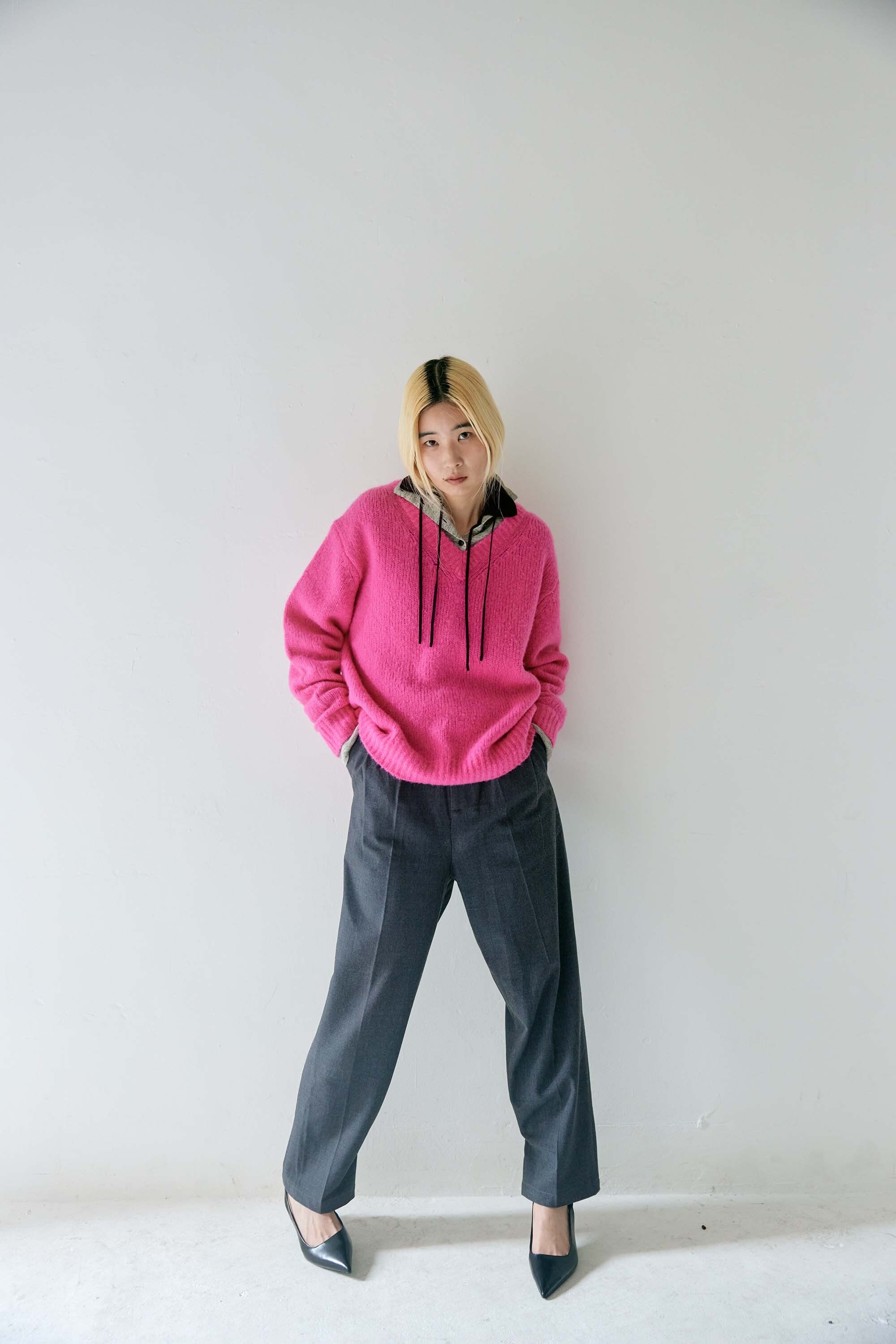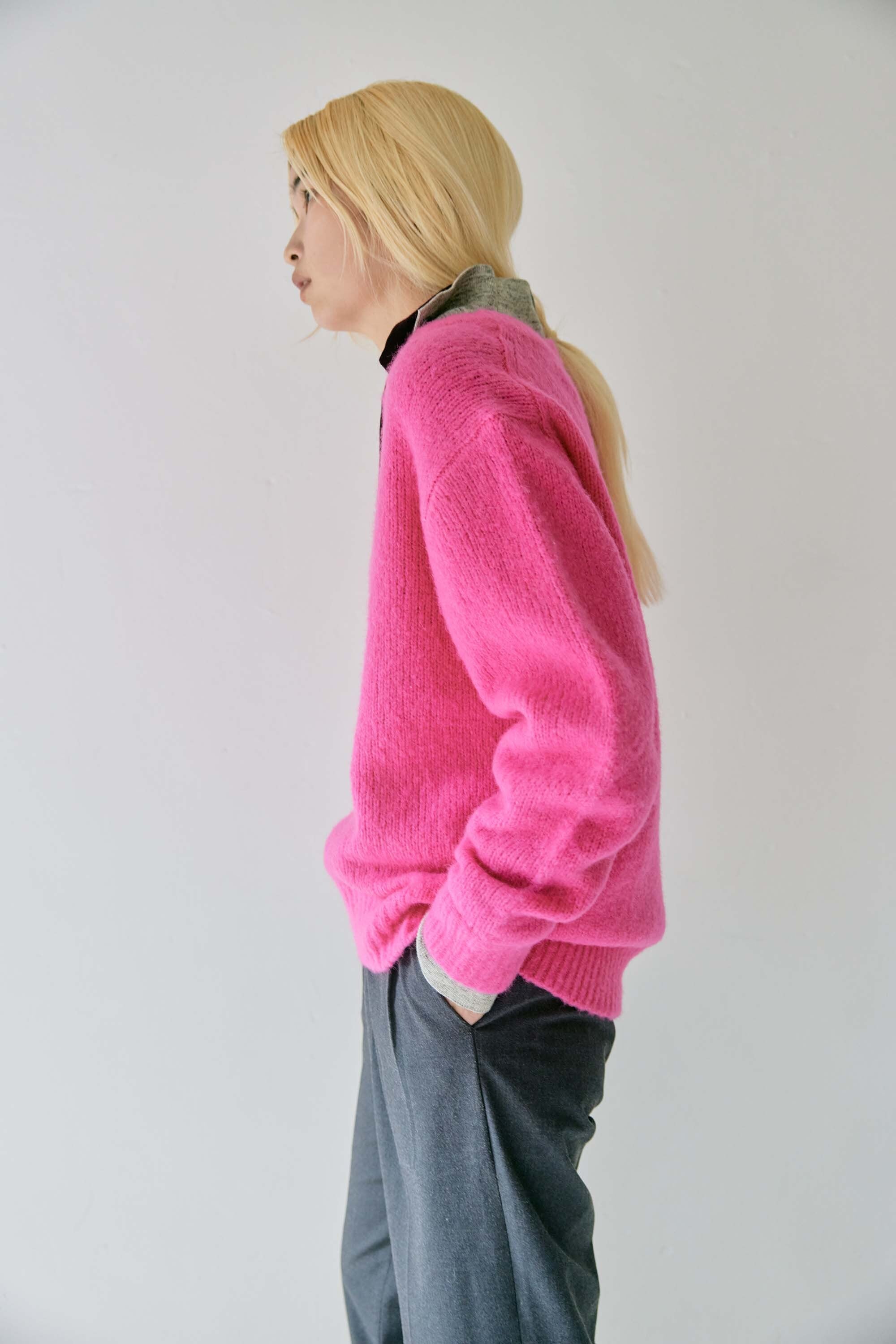 ベースの素材は前回人気だったアルパカ混のとても軽くて温かい素材を使用し、衿と袖口は綿カシミヤを使用。コートを羽織る時期でも1枚でレイヤードスタイルを楽しめるので、着ぶくれせず快適に過ごせるように考えたデザインです。