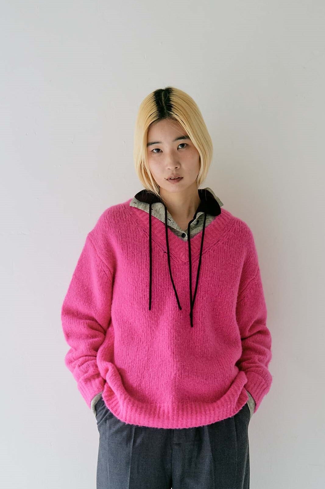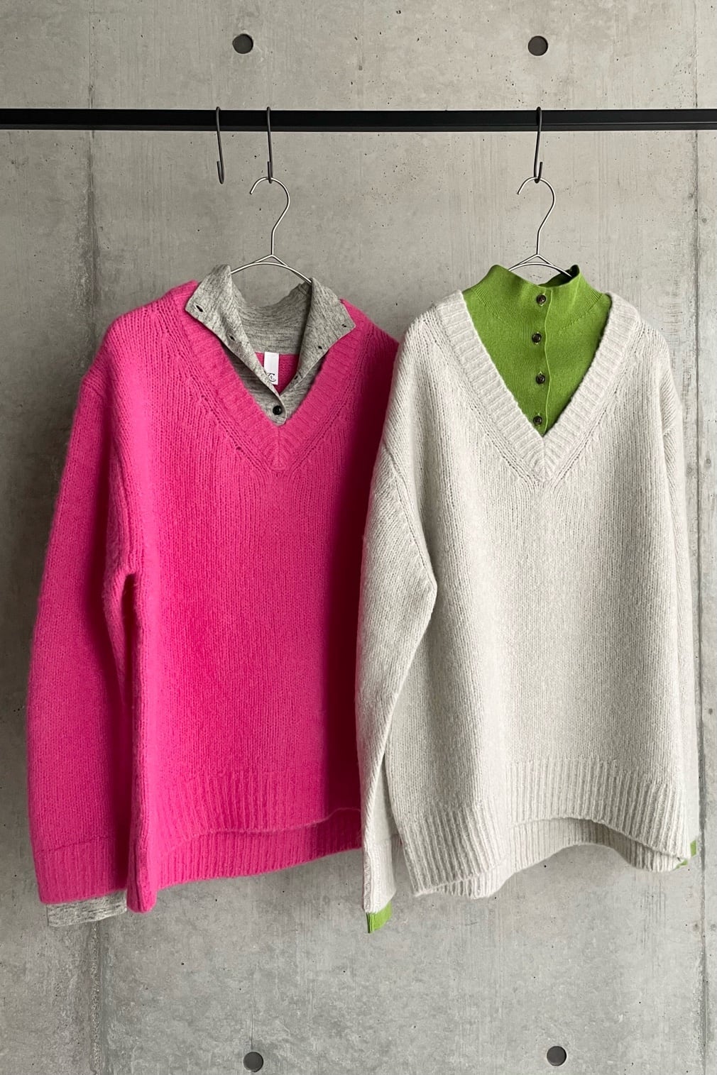 発色の良いピンク×粗挽き杢のグレー、アイボリーに近い明るさのサンドベージュ×ピスタチオグリーンの2色展開です