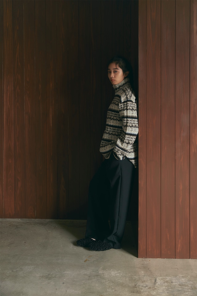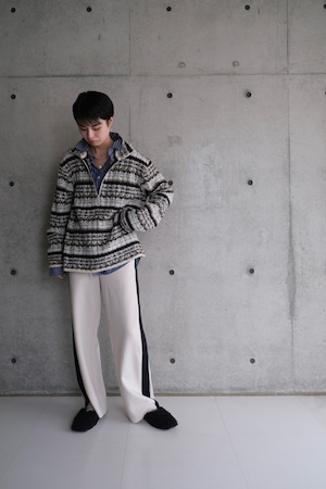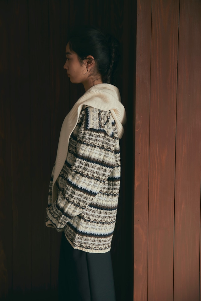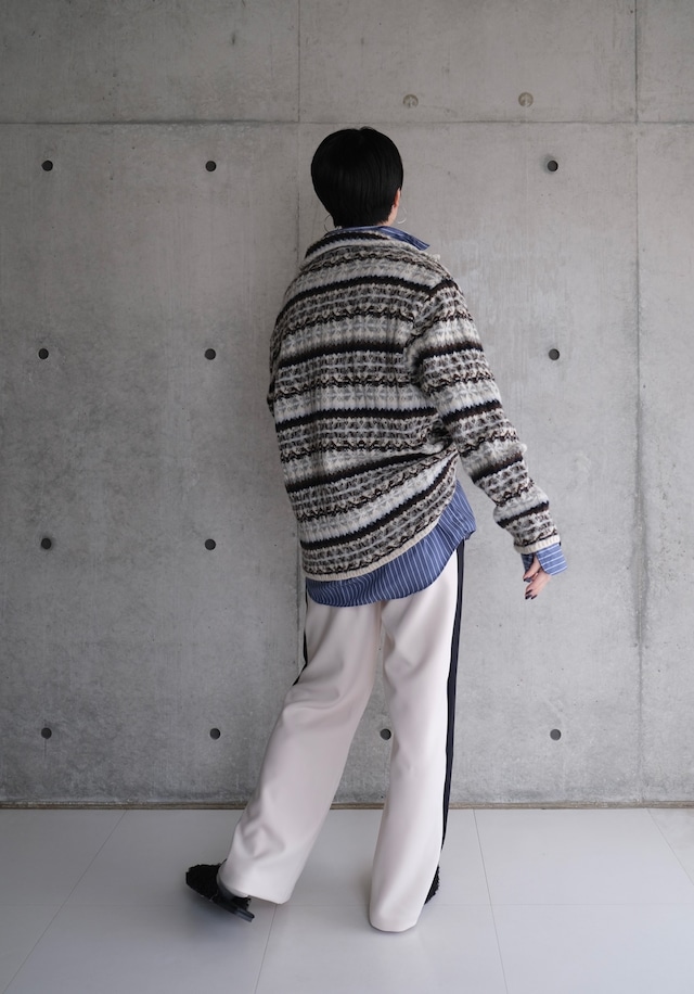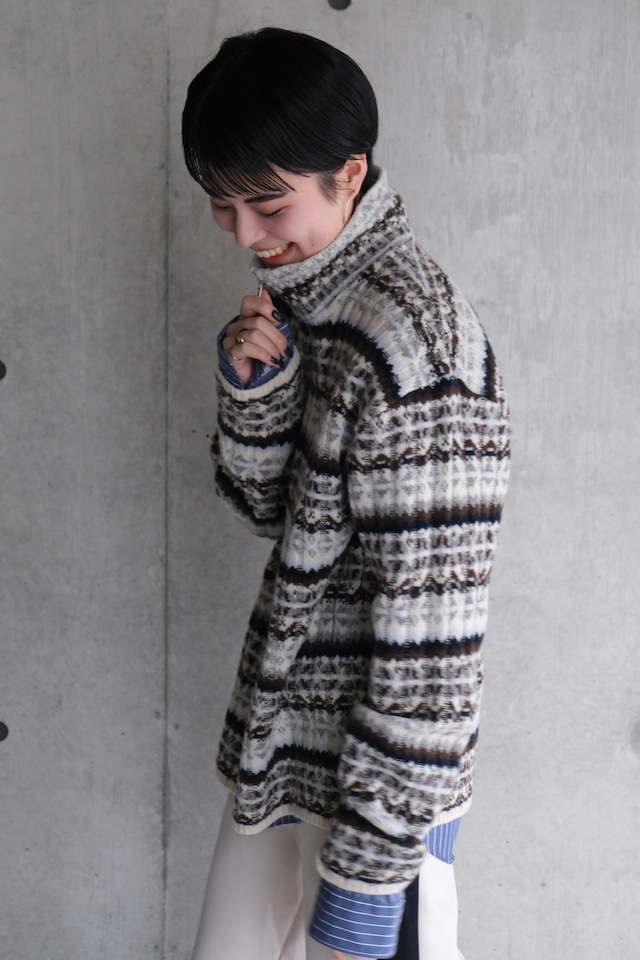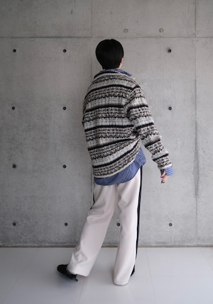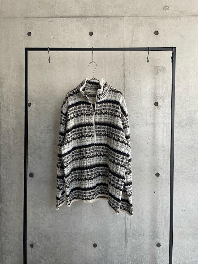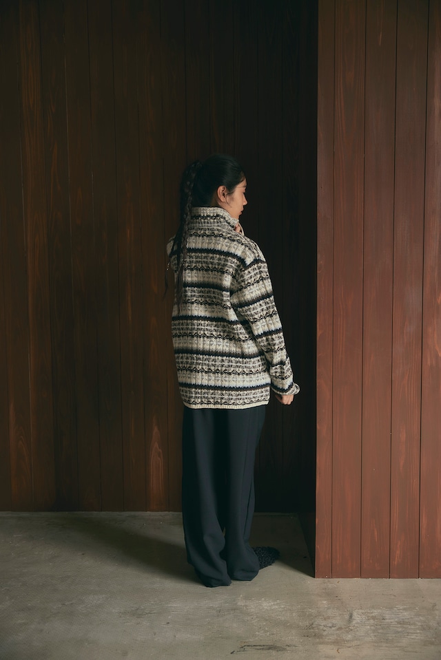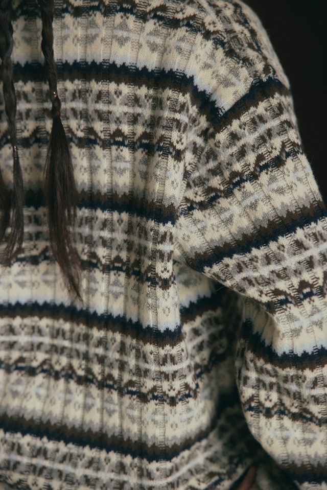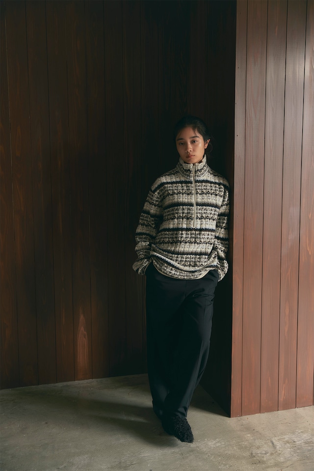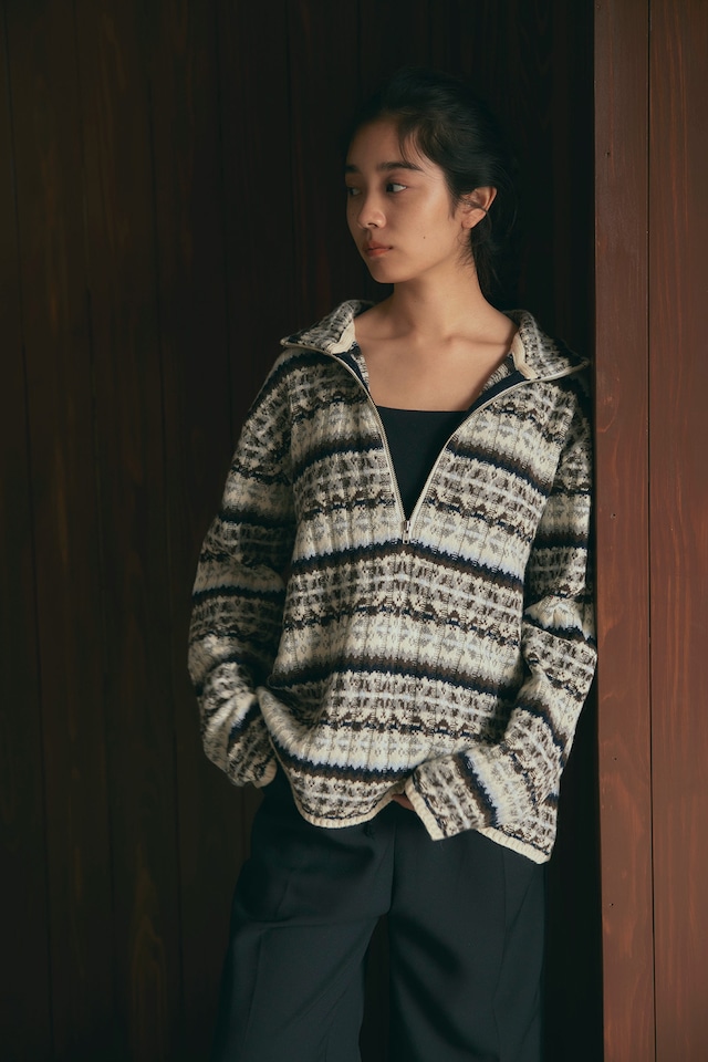 フェアアイル柄をワイドリブで編んだ、ハーフZIPトップスです。柔らかいラムナイロンをベースに部分的にブークレ糸を使用し、素材も編地も凹凸感のあるデザイン。メンズでも着られるくらいのオーバーサイズで中にシャツを合わせたりしてもオシャレです。ZIPを明けた時に出るラインや、ベーシックな配色に刺し色で水色やシルバーっぽく見えるより杢を入れていたり、ニットならではのこだわりの仕様にしております。