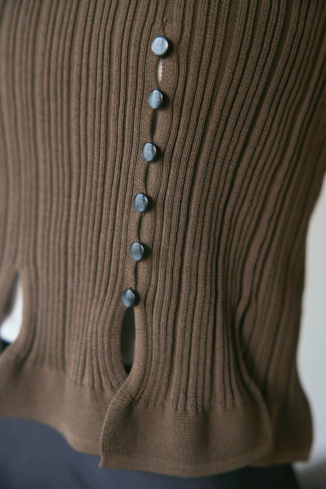 モノトーンに合わせやすいBLUE GRAYと、色物やデニムなどと相性の良いMOCAの2色展開です。BLUE GRAYにはオフ白の釦・MOCAには黒の釦が付いています。