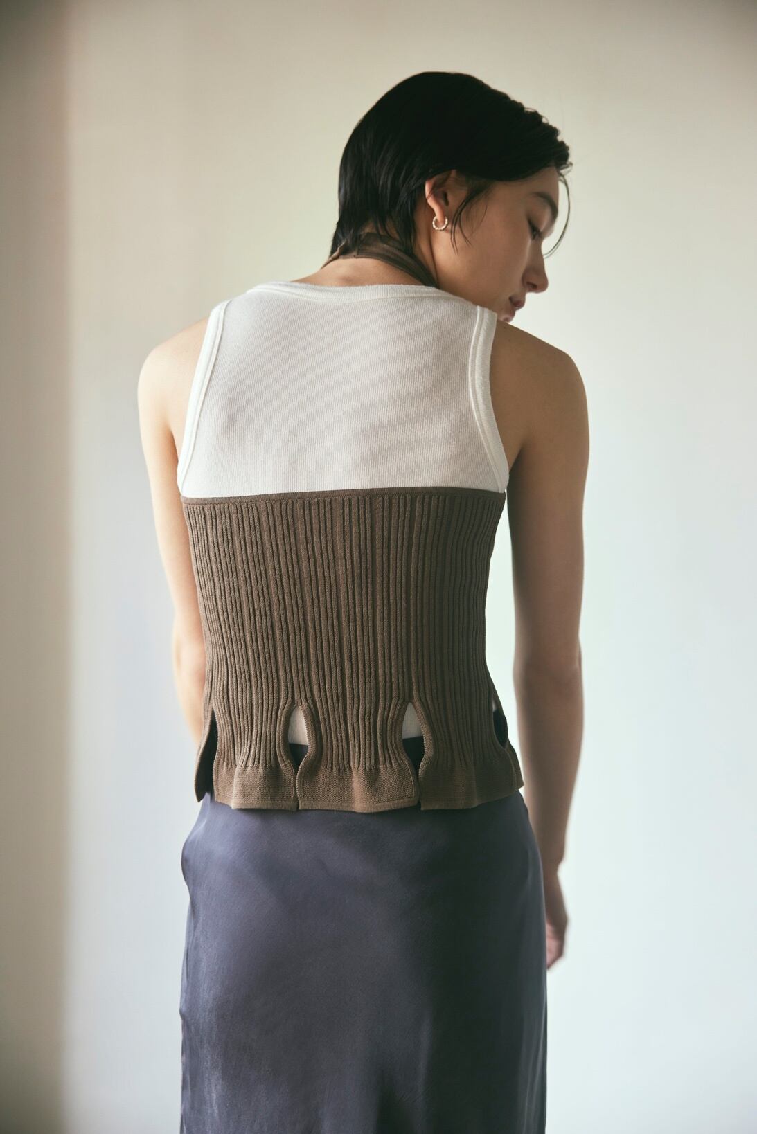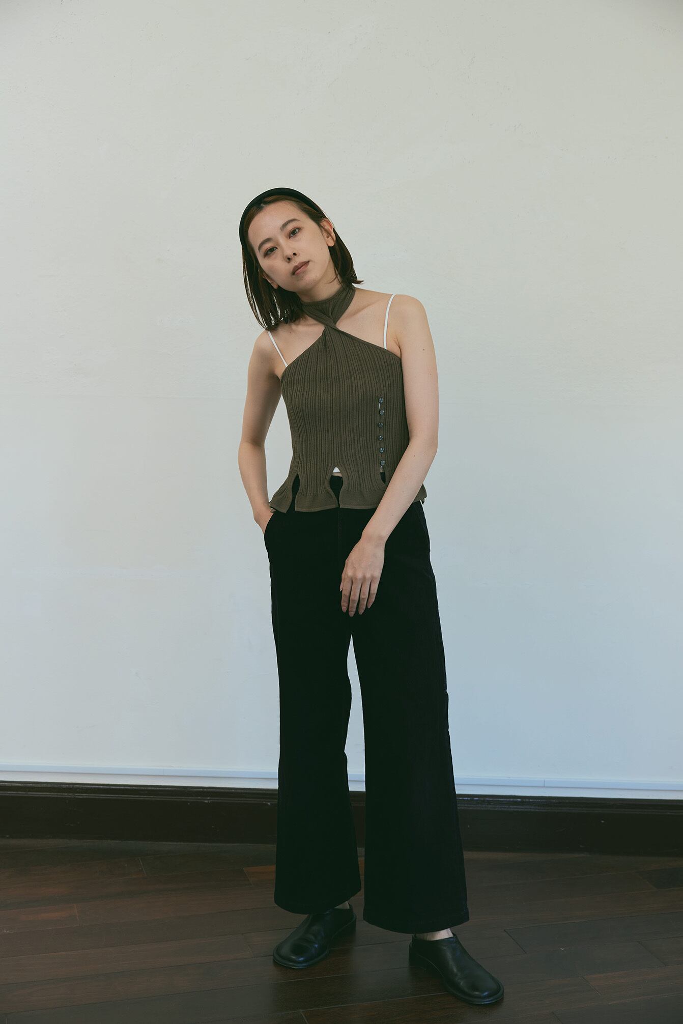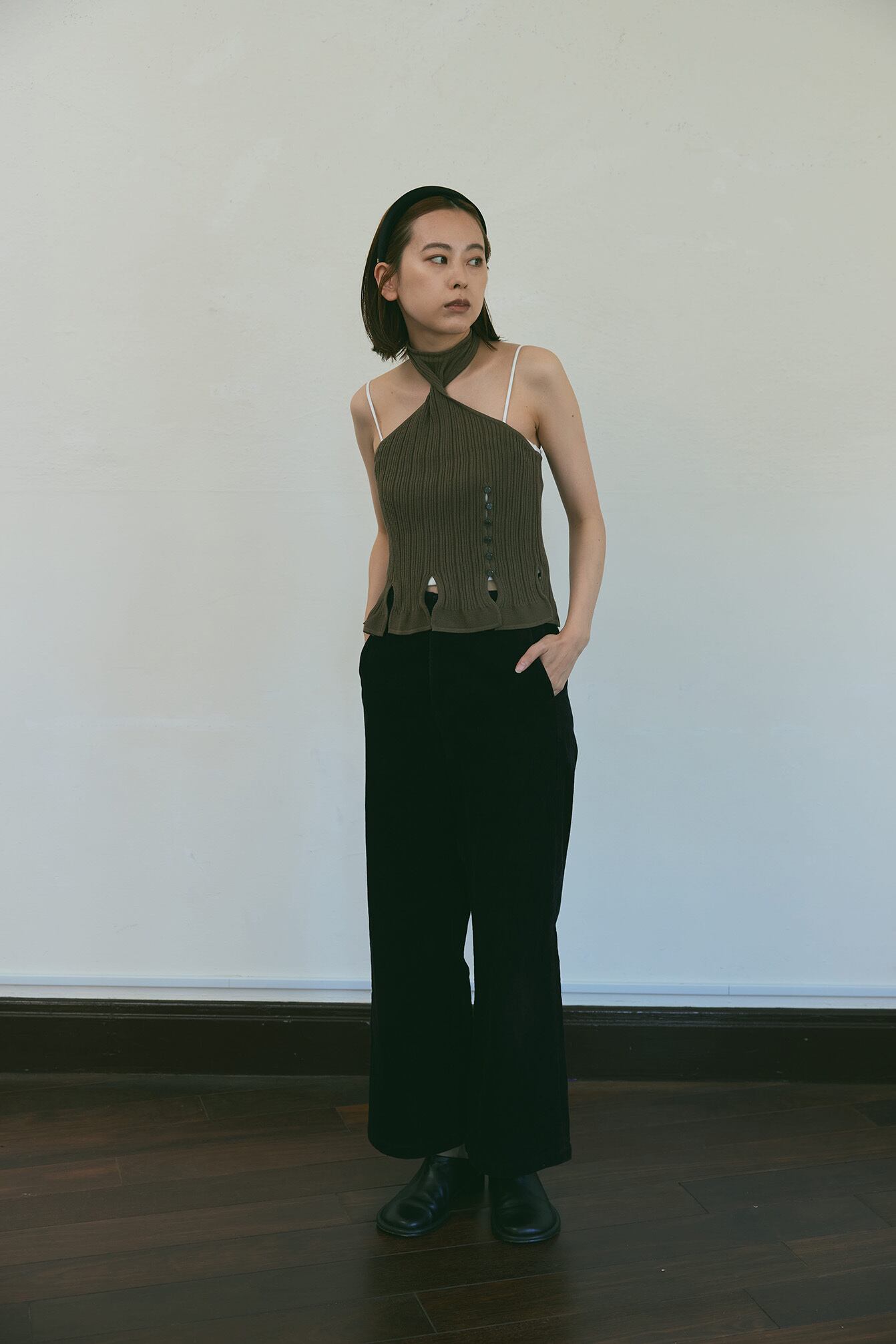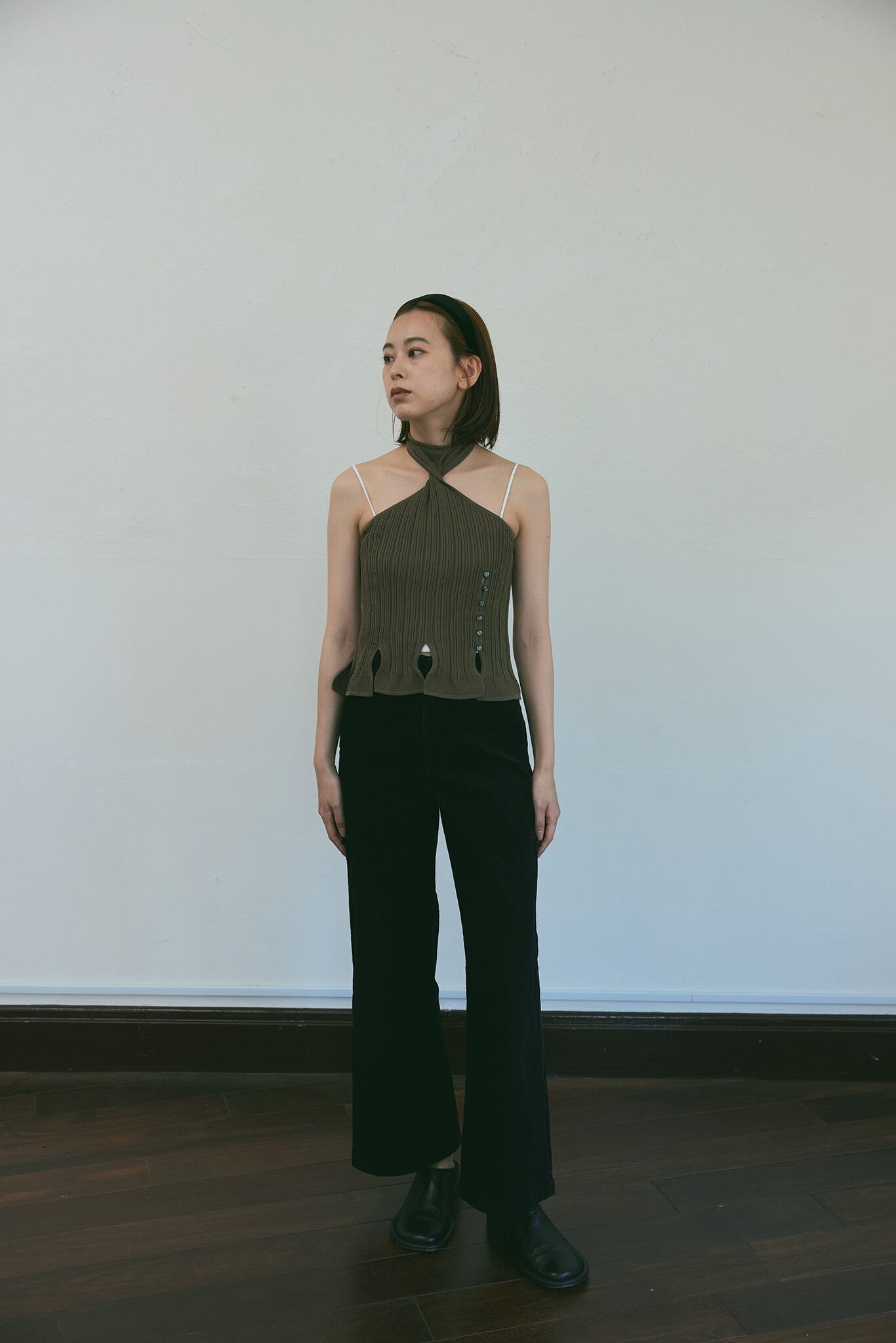 首元のねじれがポイントのホルターネックのトップスです。裾に入ったたくさんのスリットや飾り釦、クセのあるデザインですが、素材がシルケットコットンなので上品さも感じられます。1枚で着ても、Tシャツやタンクトップの上に重ねても可愛いです。