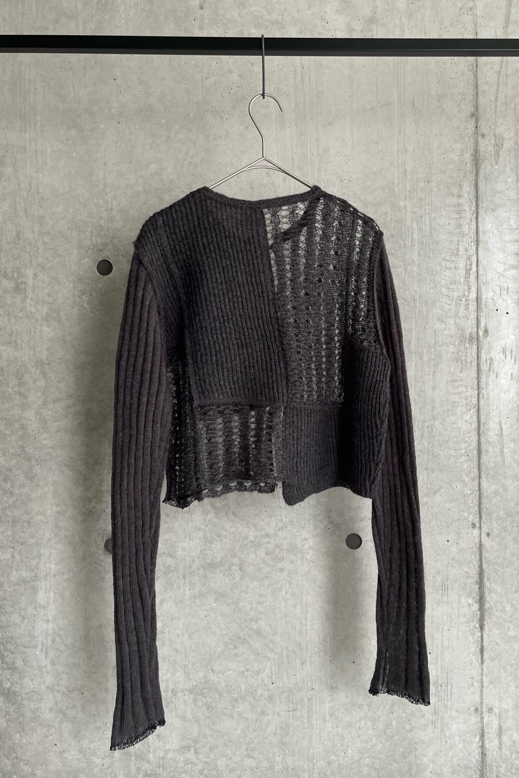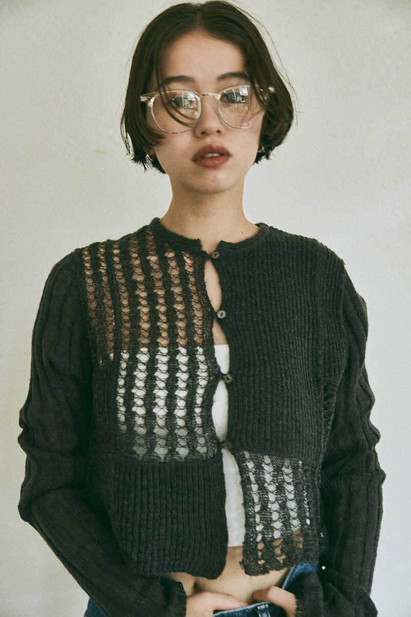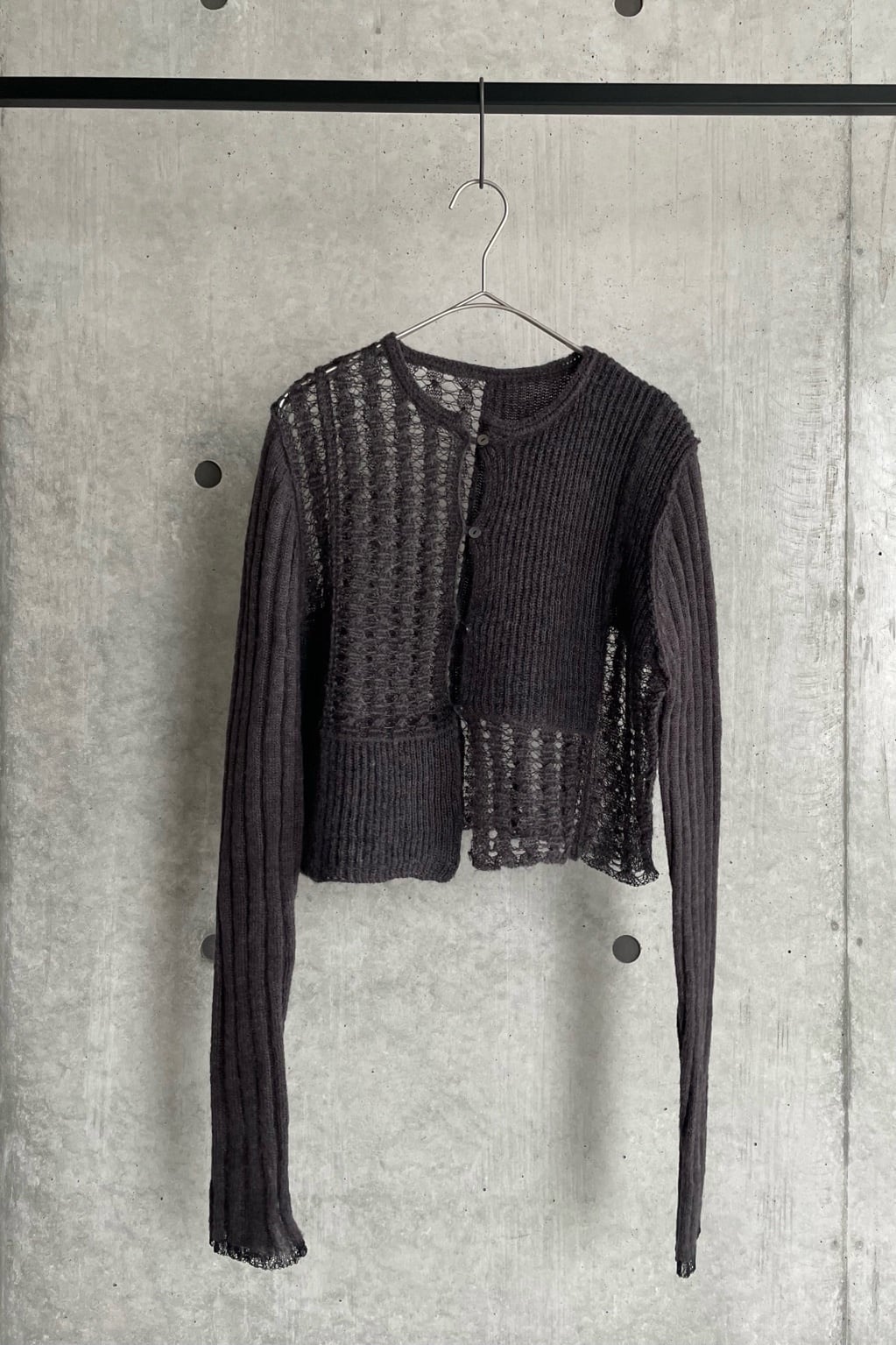 毎年大人気なモヘア混の糸とラメ糸を組み合わせたパッチワークカーディガンです。モヘア混ですがチクチクせず、1枚でも着やすく、袖はゆとりのあるリブ編みにしているので中に薄手のインナーも着やすいサイズ感です。