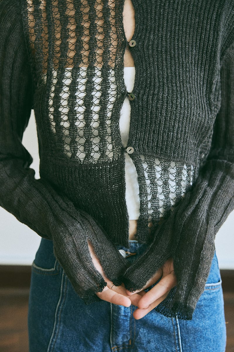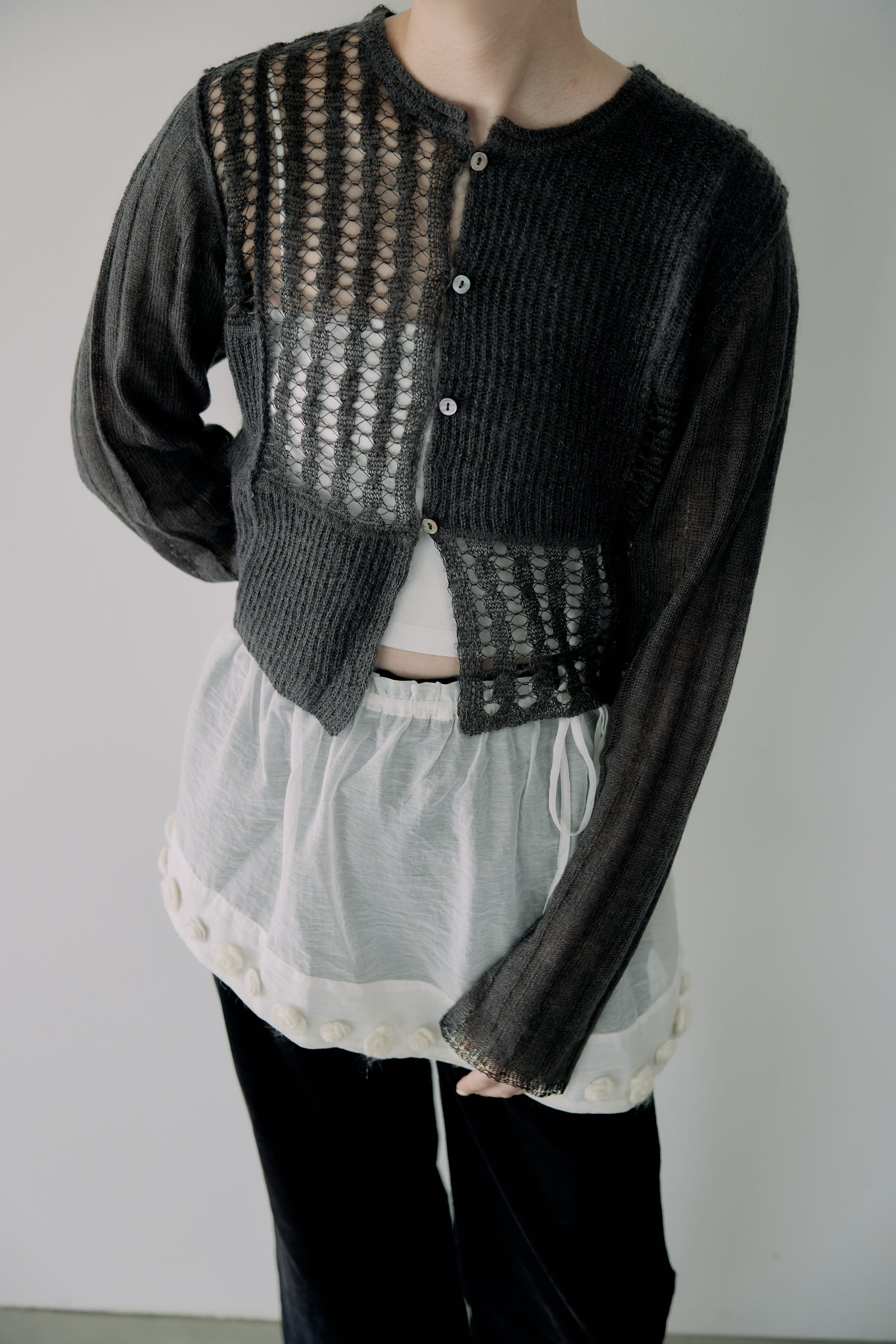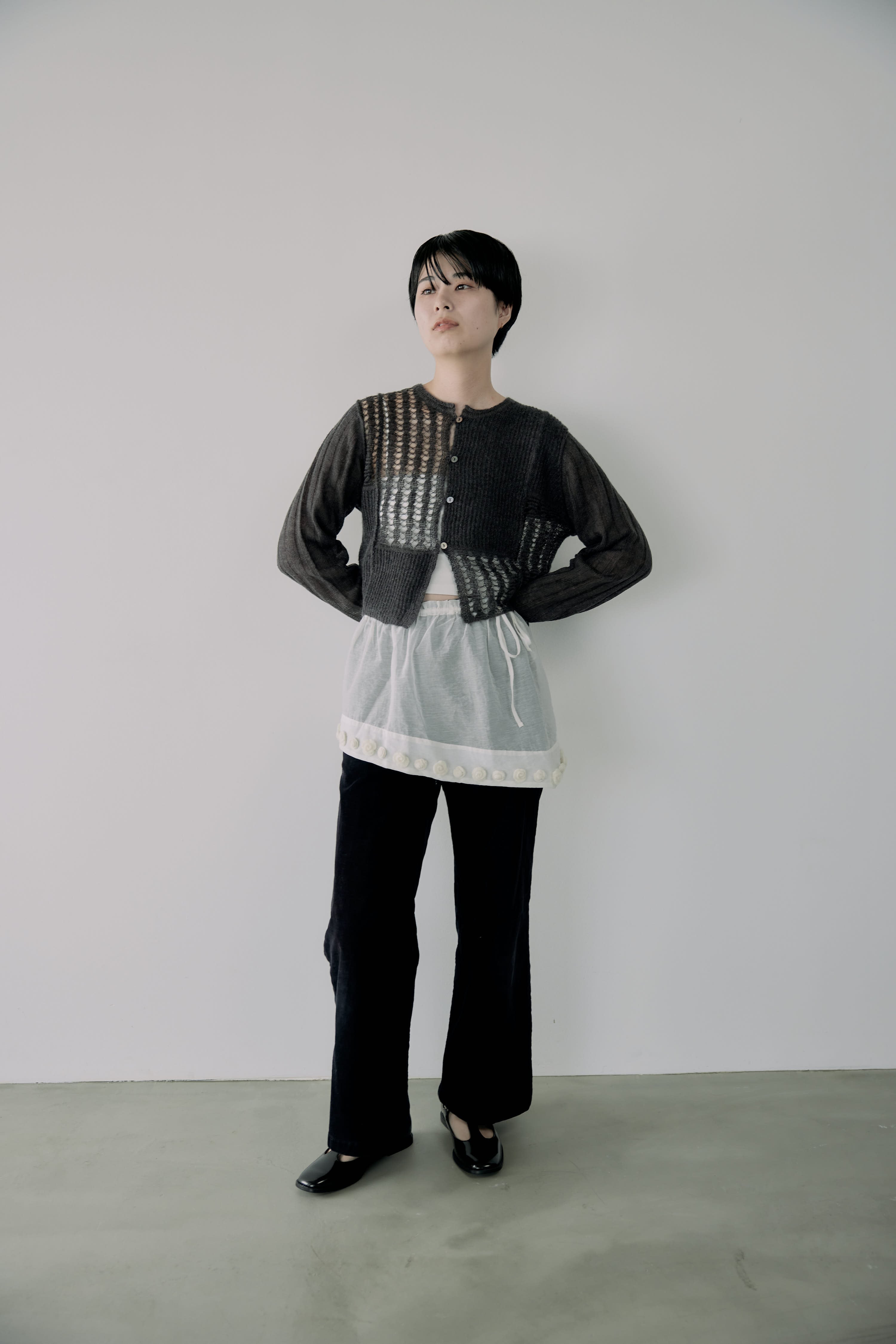 毎年大人気なモヘア混の糸とラメ糸を組み合わせたパッチワークカーディガンです。モヘア混ですがチクチクせず、1枚でも着やすく、袖はゆとりのあるリブ編みにしているので中に薄手のインナーも着やすいサイズ感です。