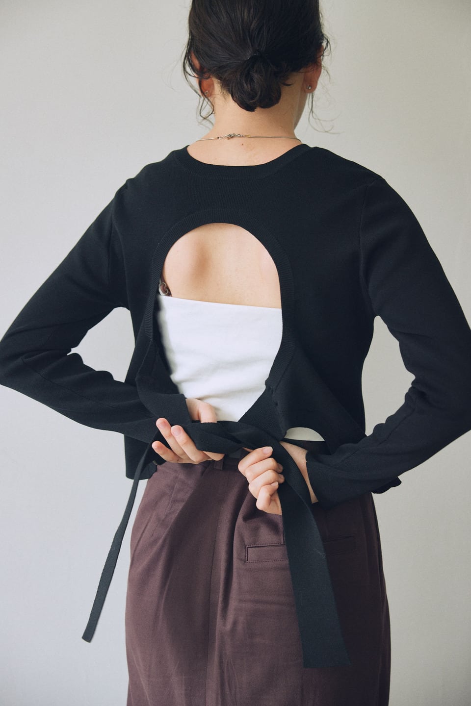 大きく開いたカッティングが特徴のトップスです。前後2wayで着用できます。シルケットコットンにストレッチ糸を引き揃えてぎゅっと目の詰まったリブで素材感はさらっとしております。全体的にあえてコンパクトなサイズ感にしており、袖丈も手首が少し出る9分丈です。カッティングの見せ方やインナーによって色々なスタイリングが楽しめます。
