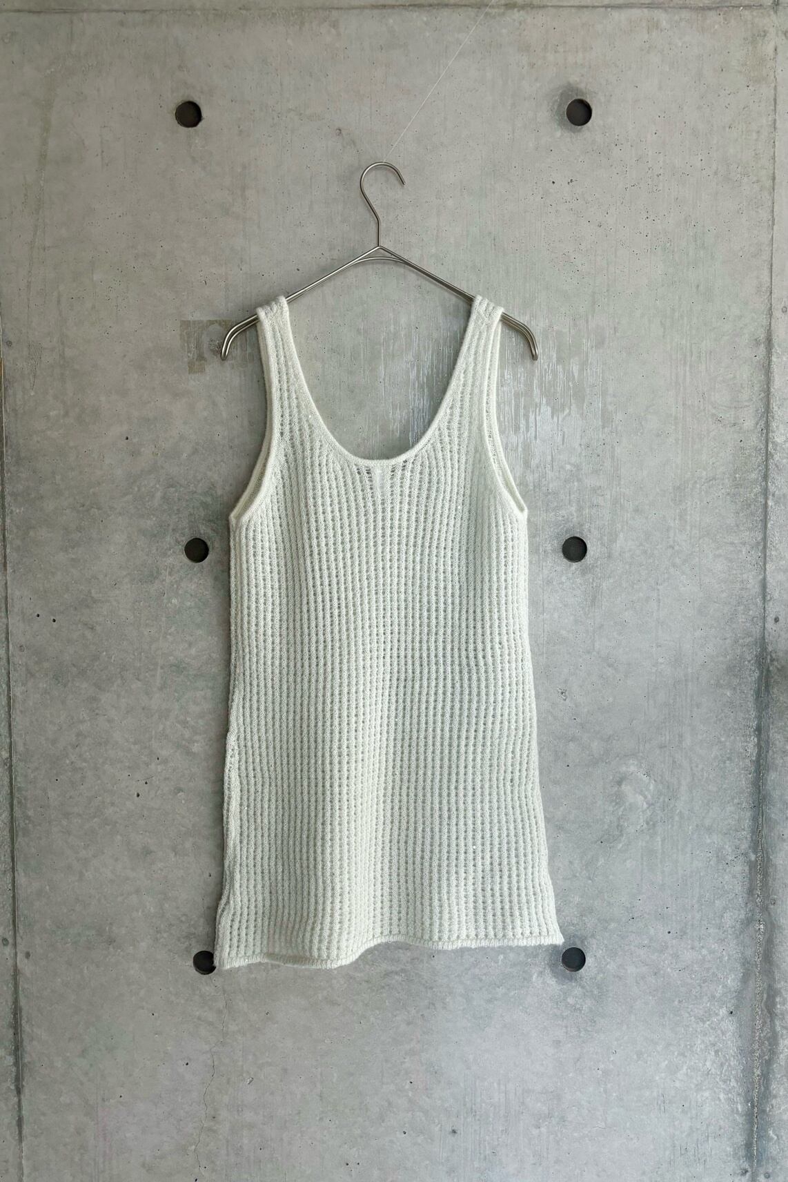 Super fine alpacaを使用した肌ざわりの良い糸に繊細なスパンコール・ラメを盛り込みました。メッシュ編みで軽く、Tシャツやブラウスに重ねるだけで可愛い1枚です。お尻が隠れる丈で、ピタピタではありませんがすっきりとしたAラインのシルエットです。