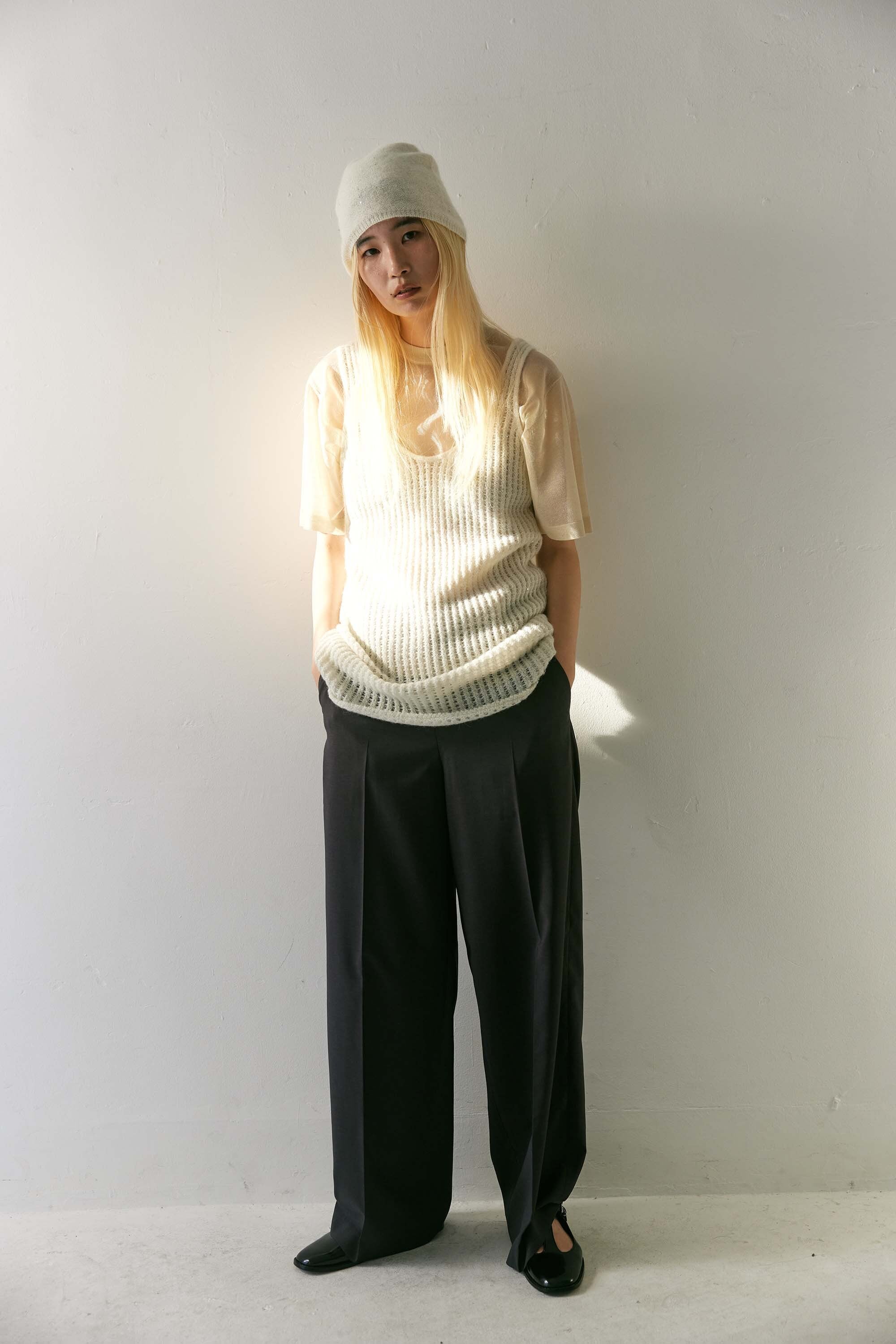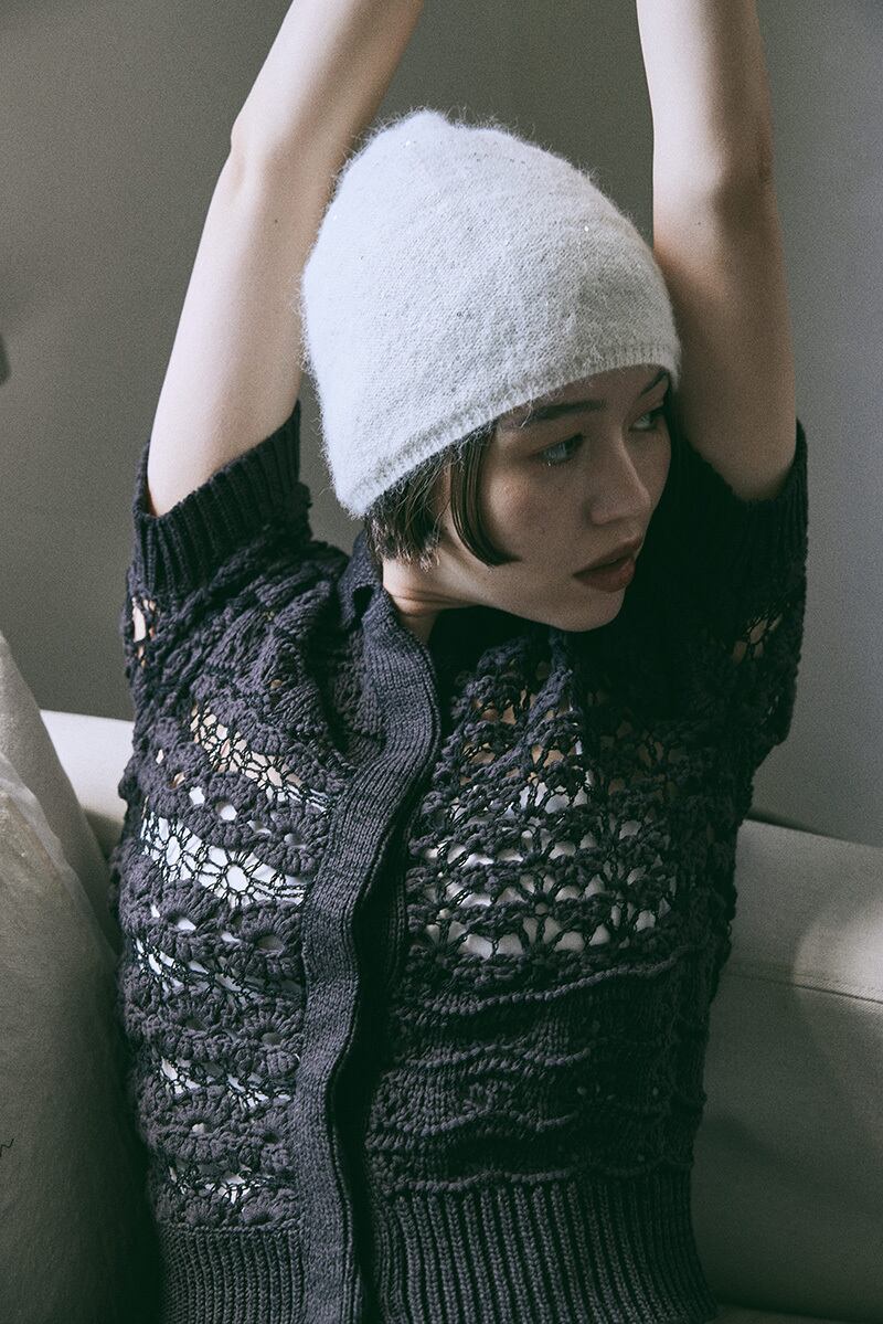 Super fine alpacaを使用した肌ざわりの良い糸に繊細なスパンコール・ラメを盛り込んだビーニーです。暗くなりがちな秋冬のコーデのワンポイントとしておすすめの1枚です。深めに被っていただくのがオススメでサイズ感は締め付けの少ないゆるめのサイズで上げております。