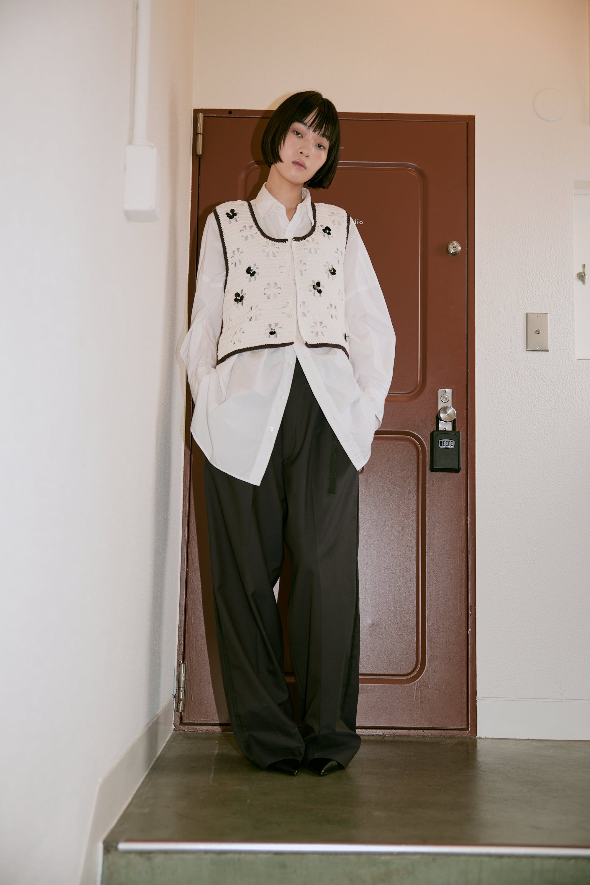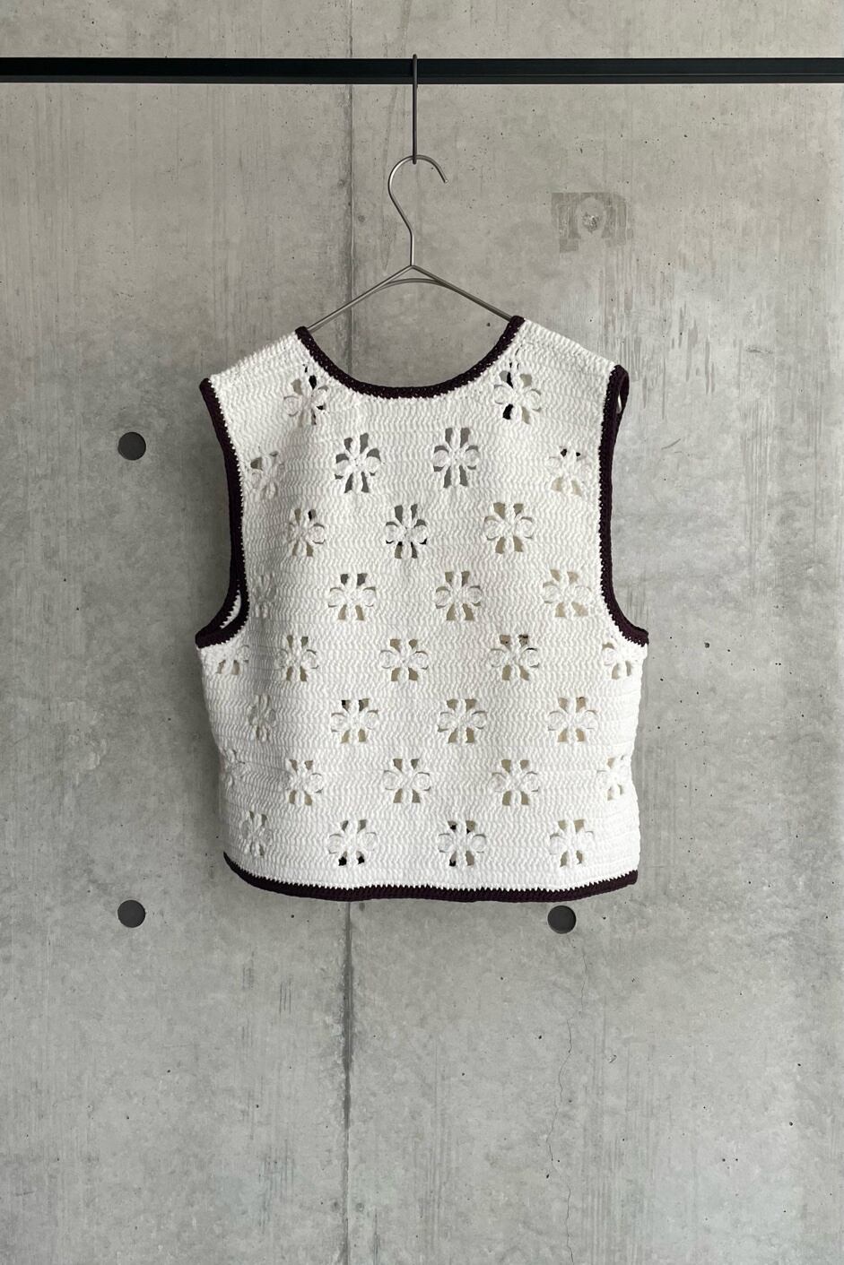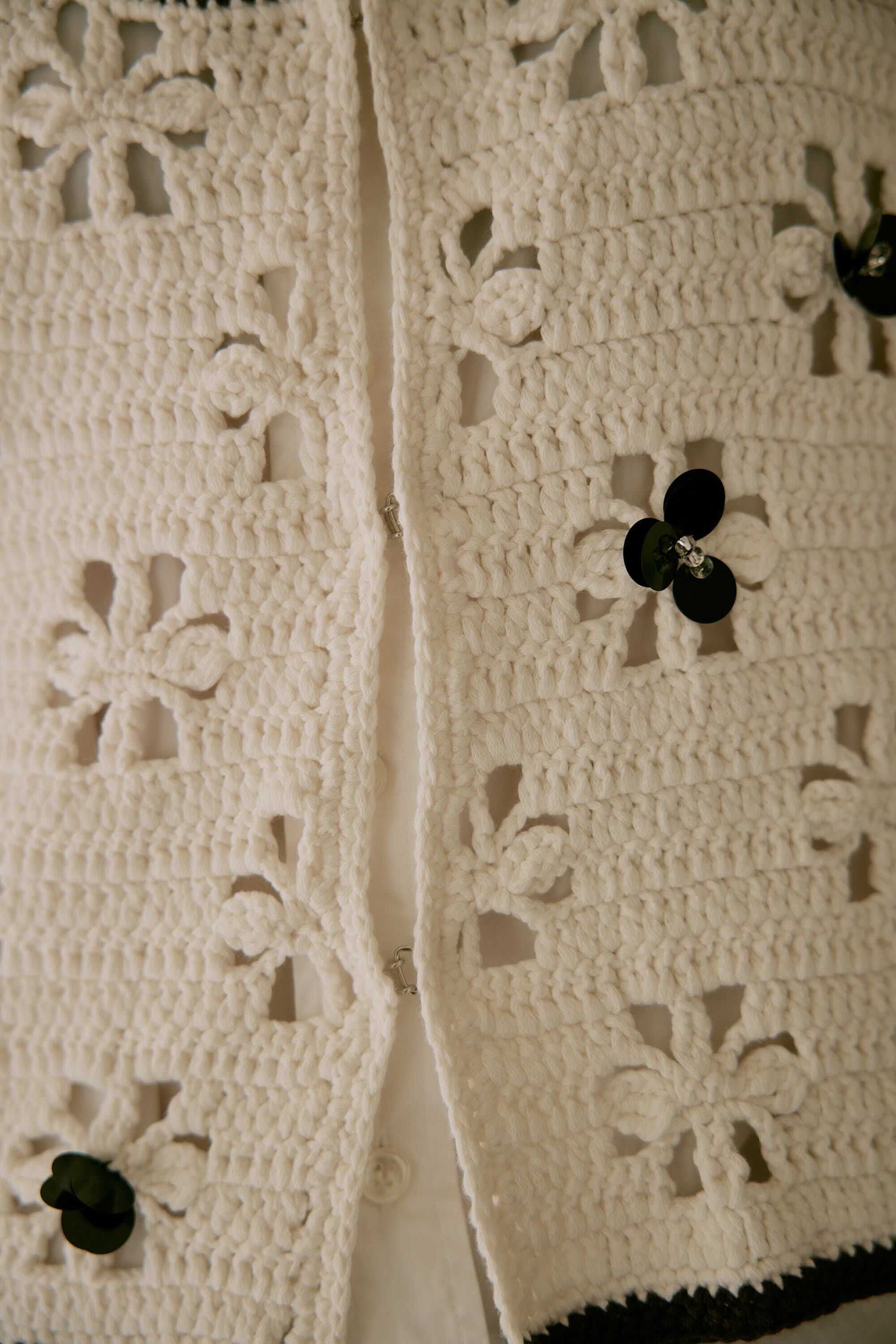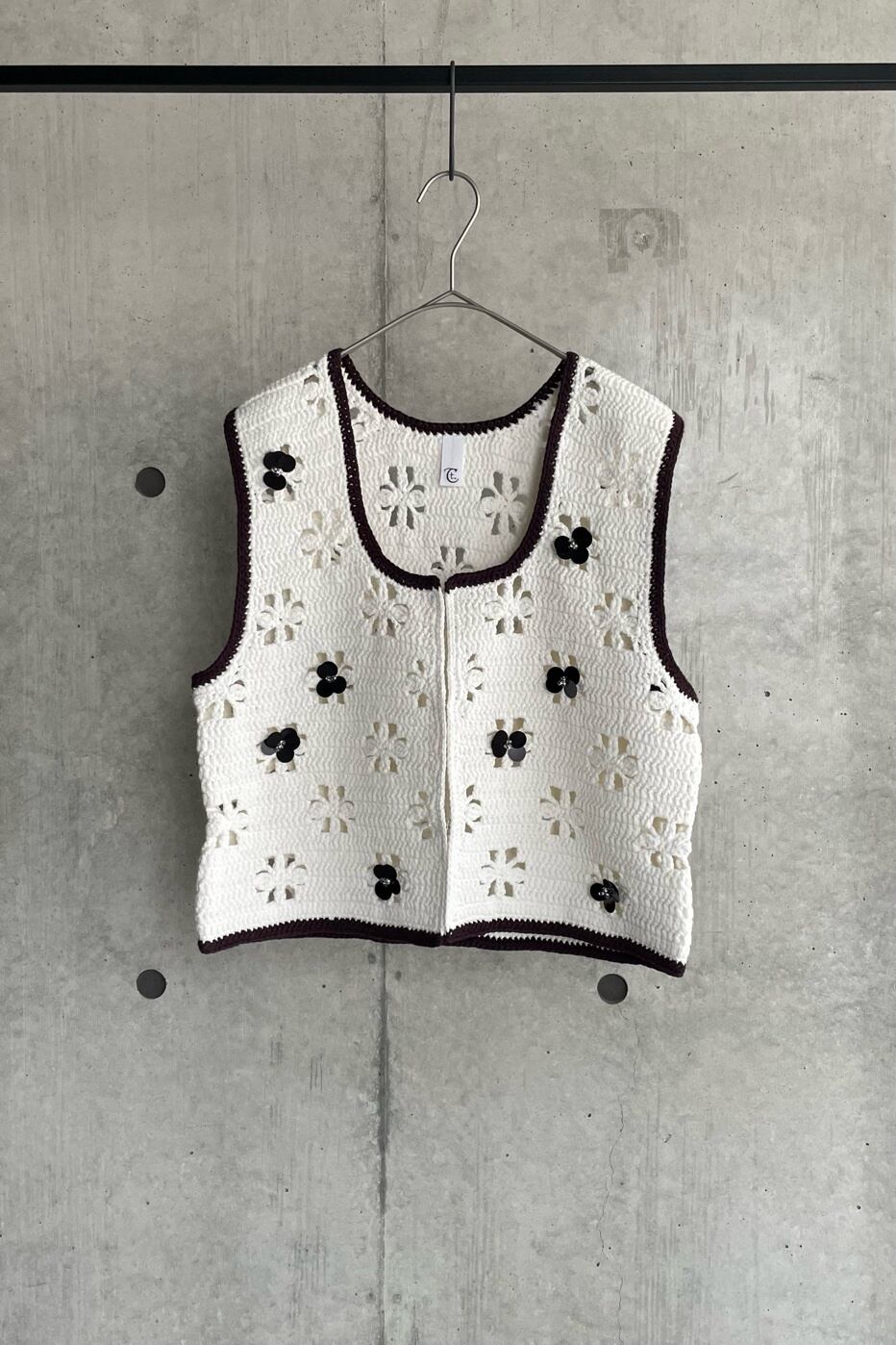 綿100%のリリヤン糸を使用し、全て手編みで仕上げたベストです。花柄に抜いたクロシェ柄が可愛く、さらにスパンコールとビーズでデコラティブに仕上げました。
